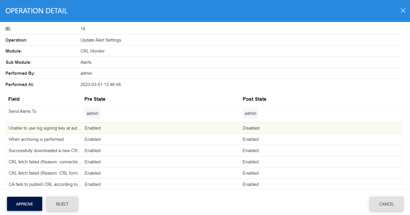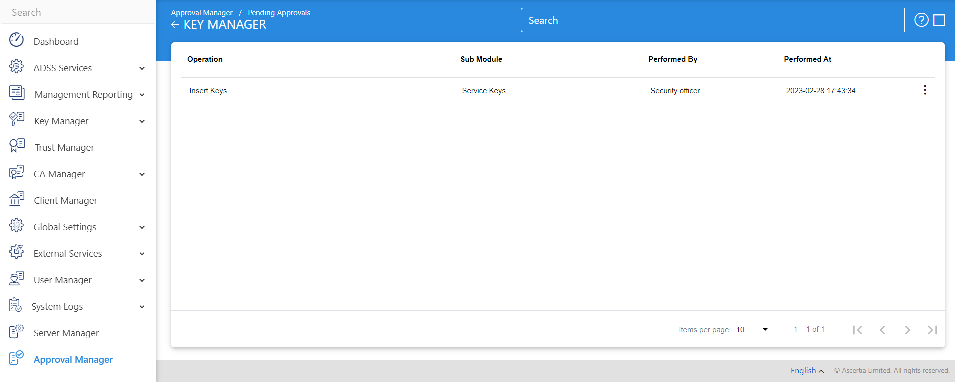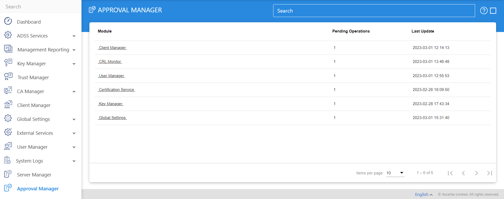 Security Officers (SOs) can click the Approval Manager link and see a list of pending operations for each ADSS Module: