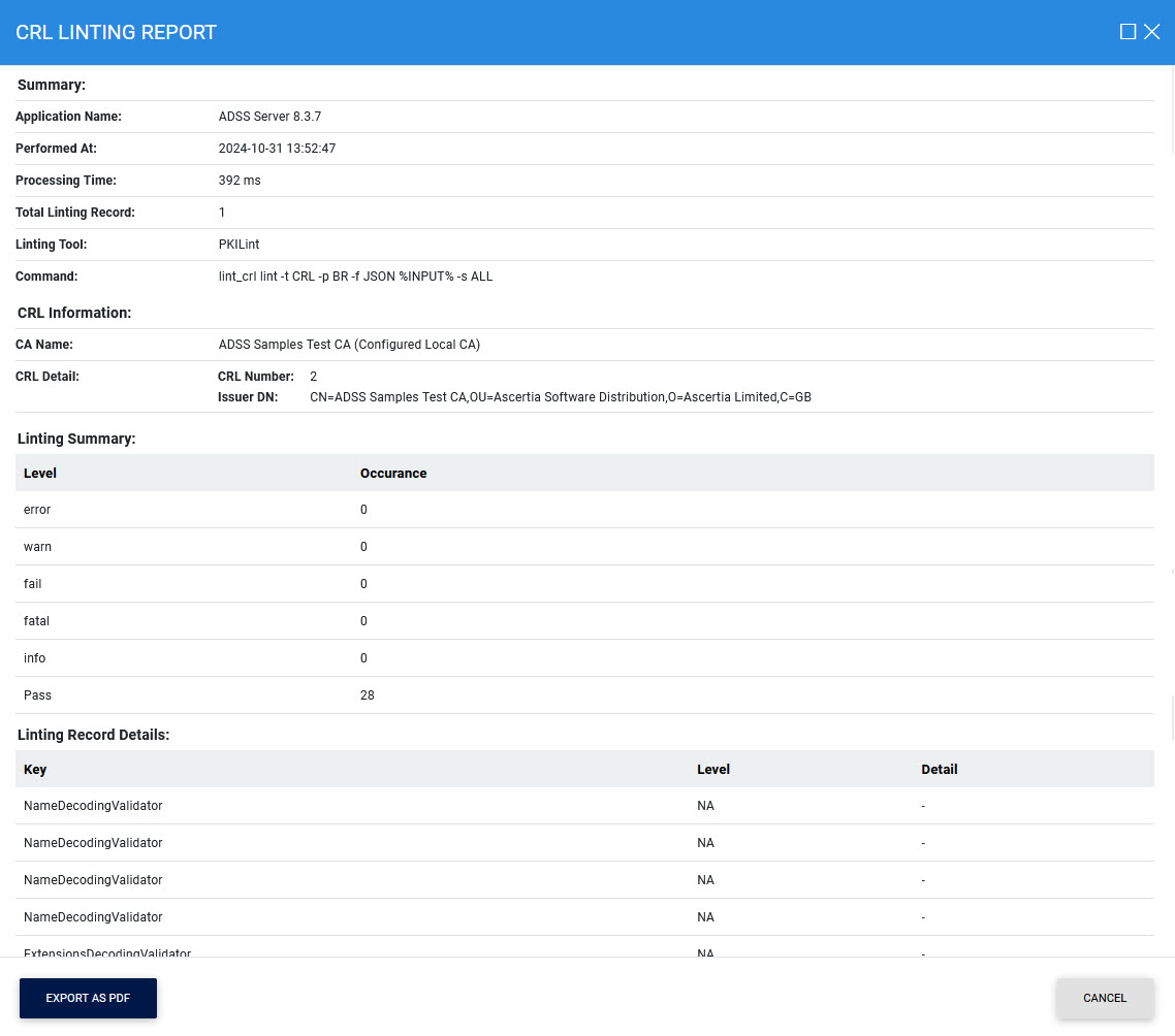 After selecting the linter, click Show Report to display the linting details of the CRL: