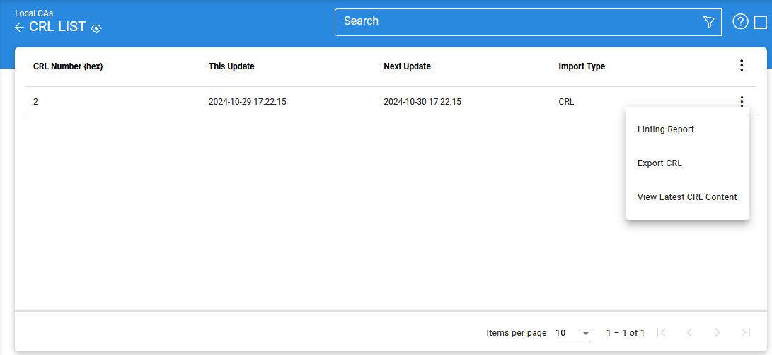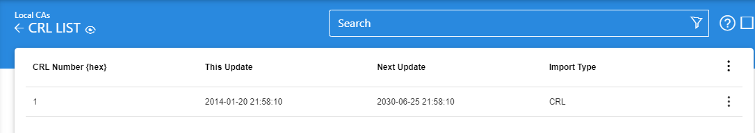 In Manage CA the View CRLs function provides the ability to view and search the CRLs that have been published by a Local CA. When a CA is selected and the View CRLs button is clicked then all the CRLs previously retrieved for that CA are displayed as shown below: