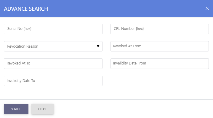 The contents of a CRL can be searched by clicking the Advanced Search icon. This will show the following options for searching for a particular certificate in the target CRL: