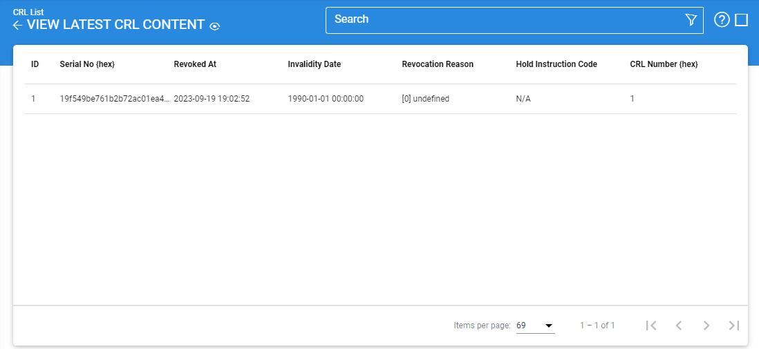 Clicking on the View Latest CRL Contents button shows the details of all revoked certificates contained within the latest CRL:
