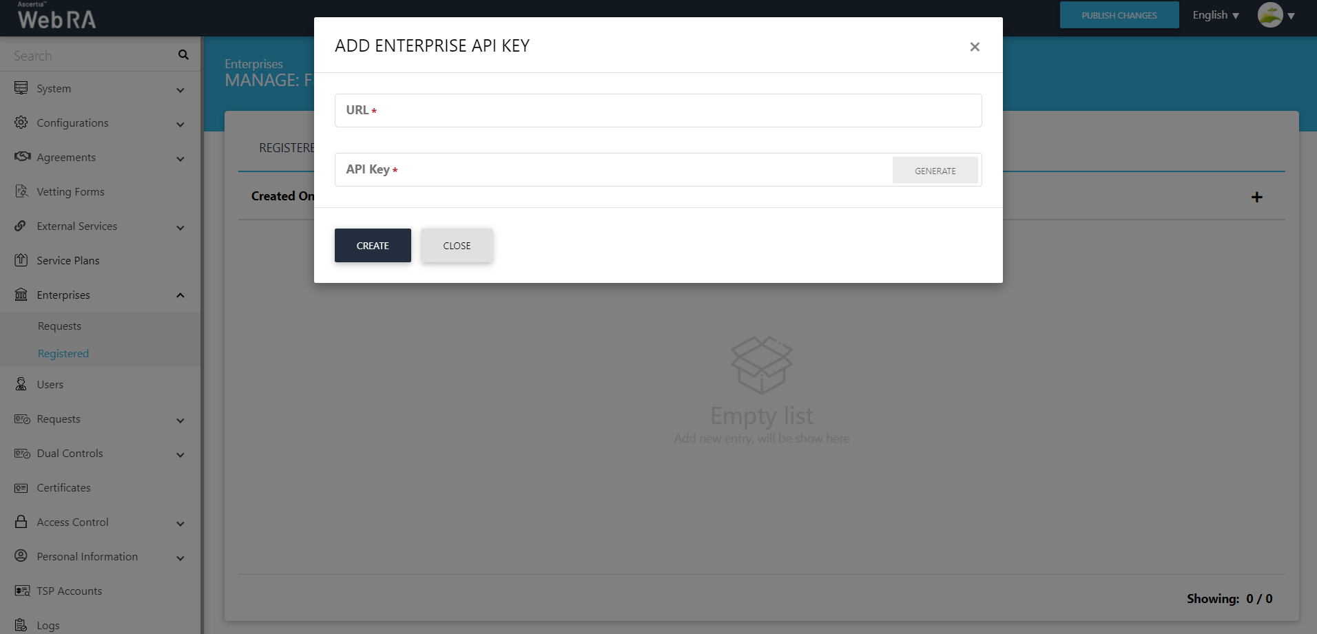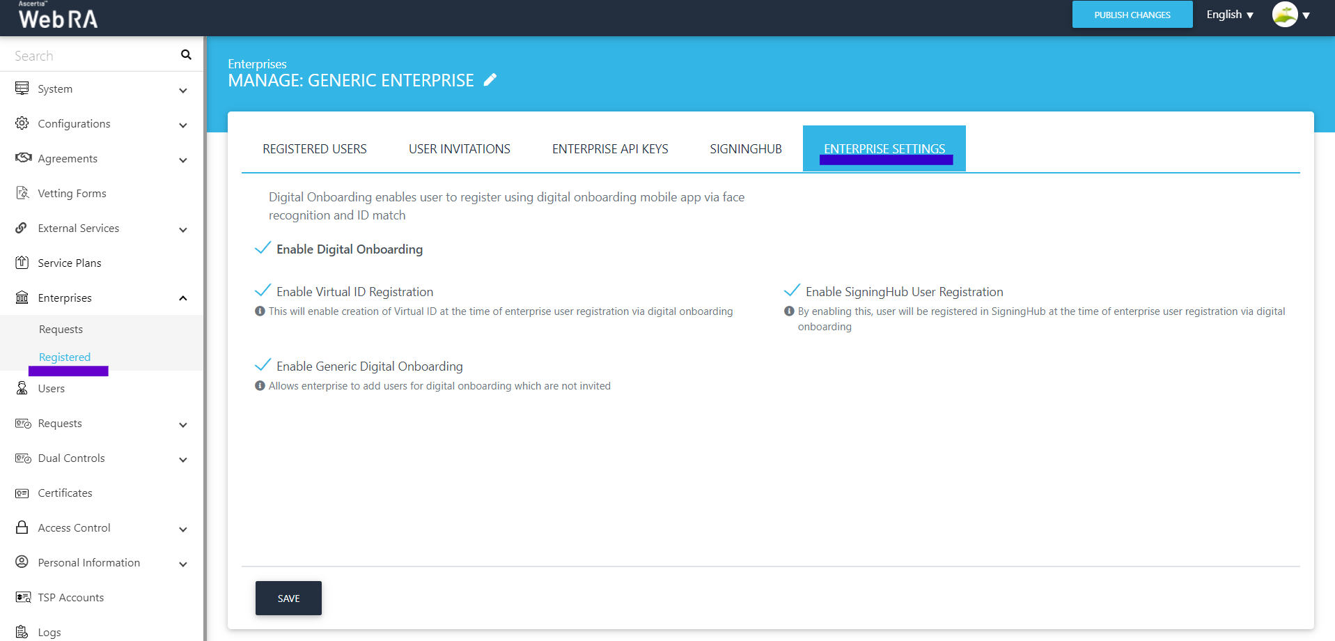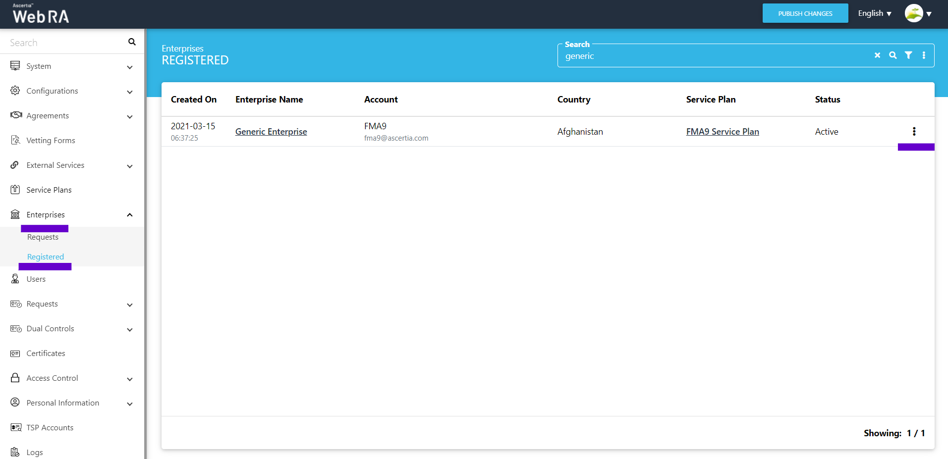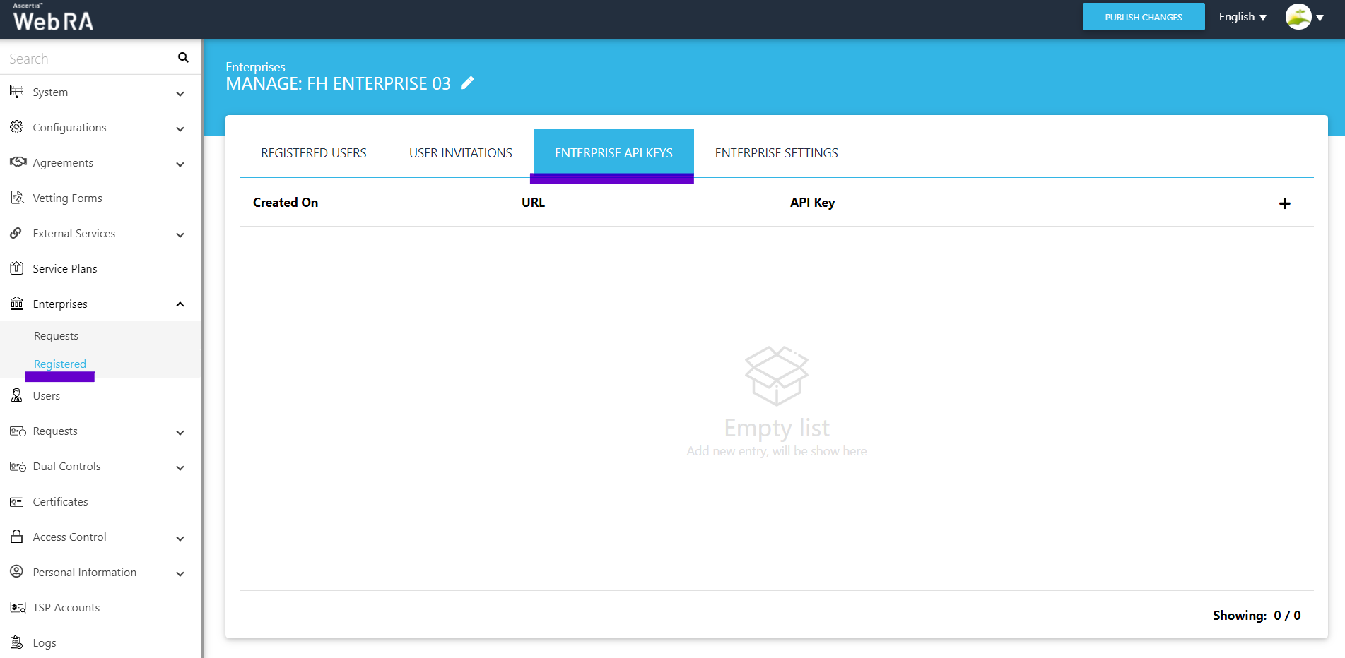 - Click Enterprises on the left pane of the Web RA Admin Portal, then click Registered.