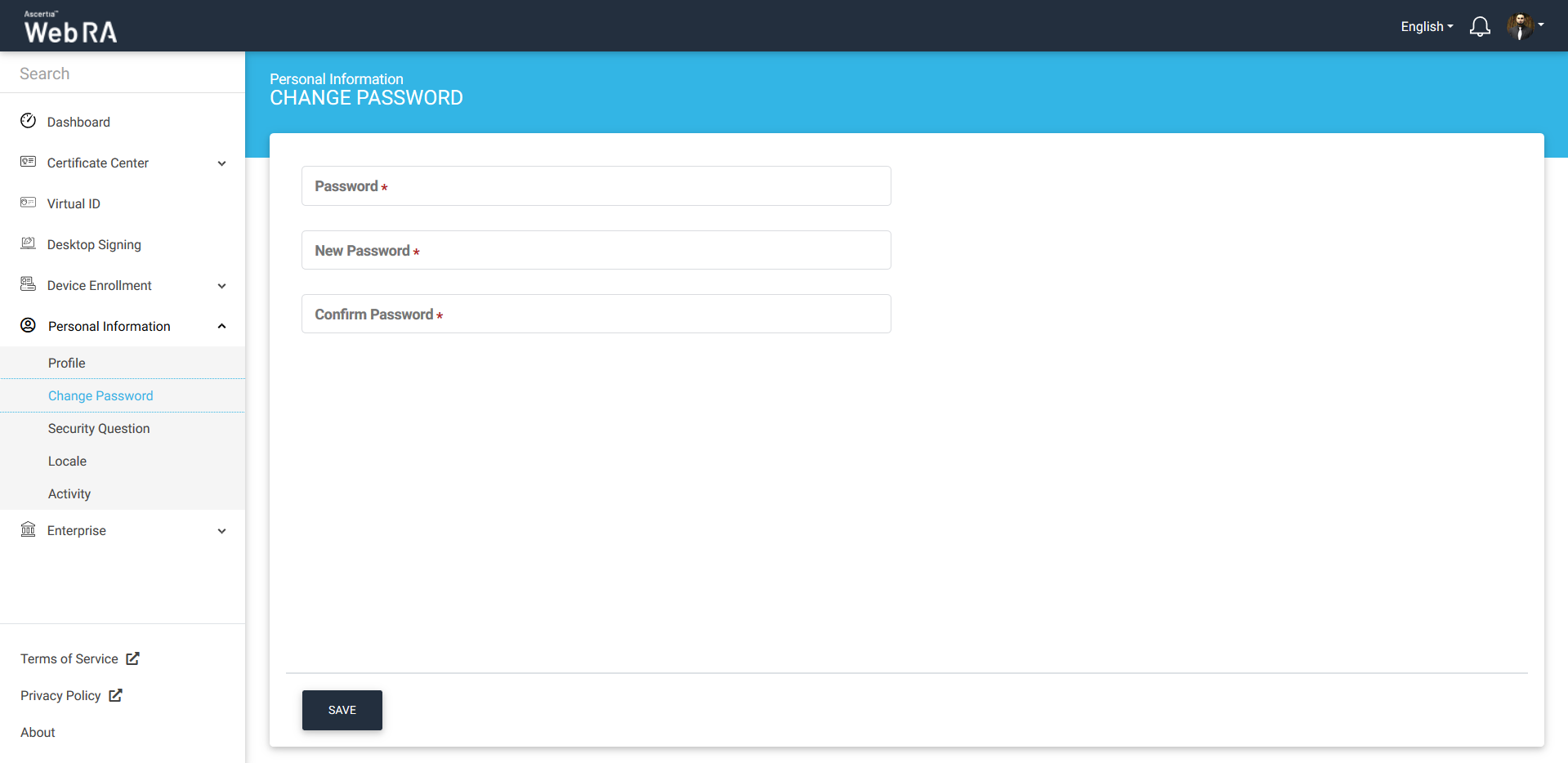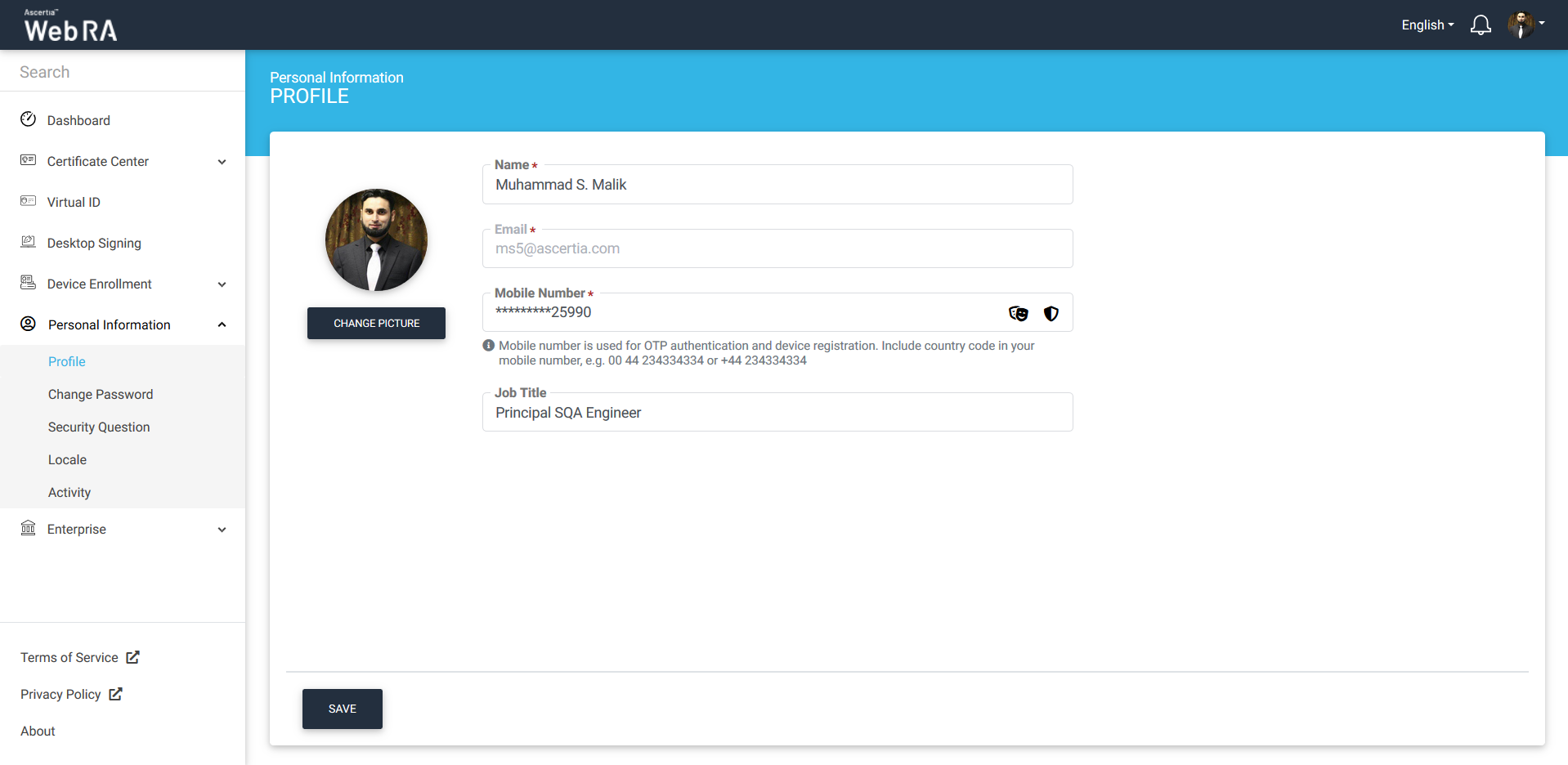 You can update your personal information, change your password, security question/answer and locale for your registered account. You can also view your activity that you have performed using Web RA user's portal.