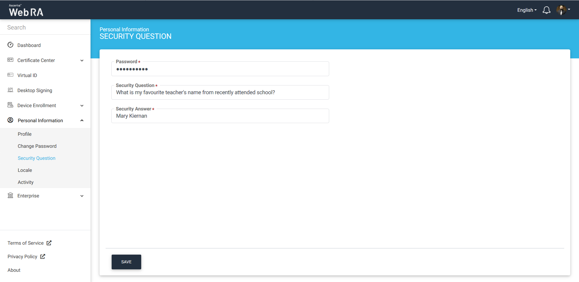 It is often observed that people forget their passwords from time to time. So in order to recover your forgotten password, Web RA lets you set a security question, which can alternatively be used to confirm your identity.