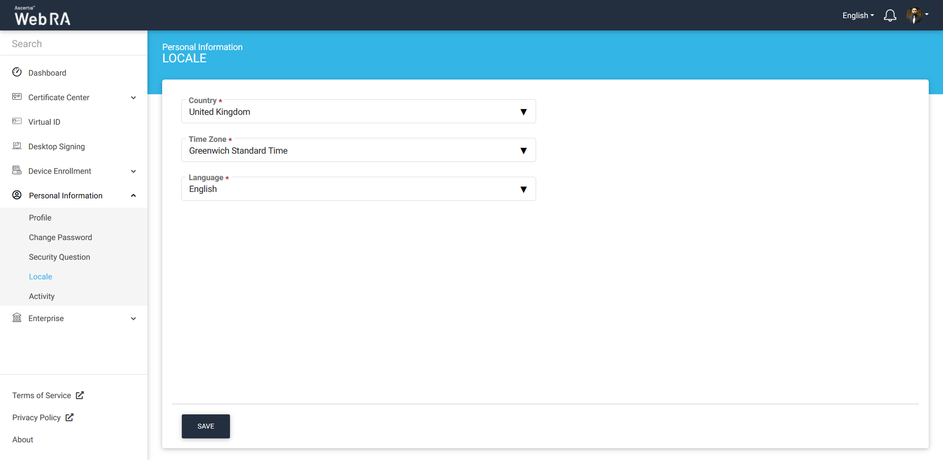 1. Complete the fields accordingly, i.e. specify your country, time zone and language. From the Language field select your desired language in which you want to use Web RA. The entire GUI of your Web RA account will be displayed in the selected language.