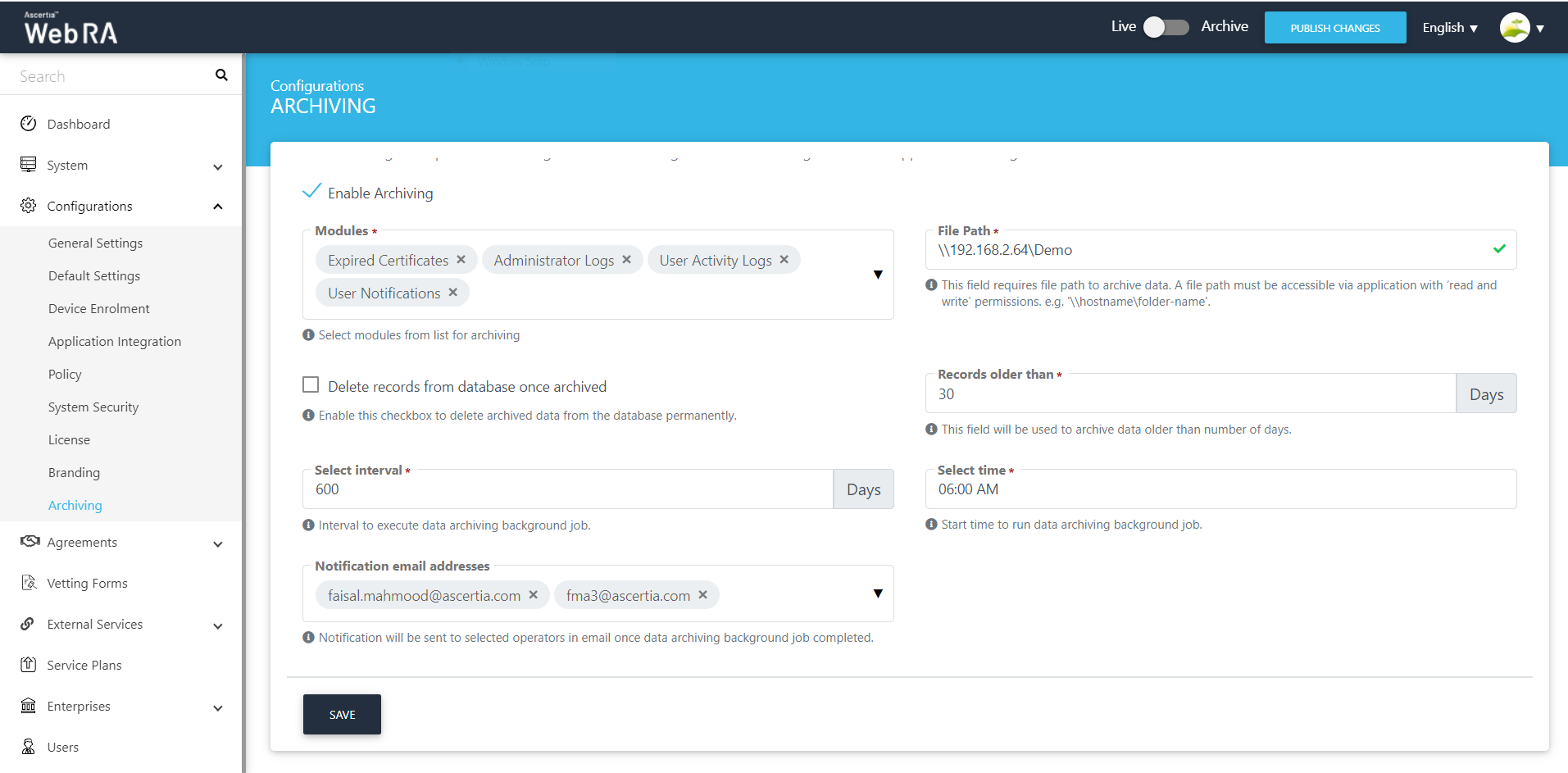 In order to enable auto archival an operator needs to navigate to the configurations and tick the Enable Auto Archiving checkbox as displayed here: