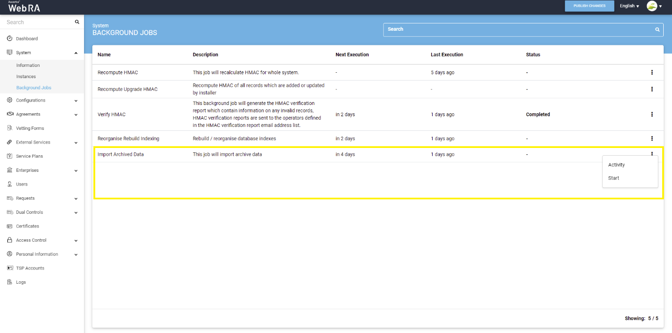 - If dual control i enabled in the settings, then these configurations will require approval from both operators and the background job will be executed according to the configurations.