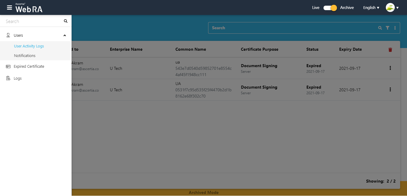 - All the menu options will be shown based on the operator's role and operator's type. For instance, an enterprise RAO will only be able to see expired certificates of the enterprises that he manages.