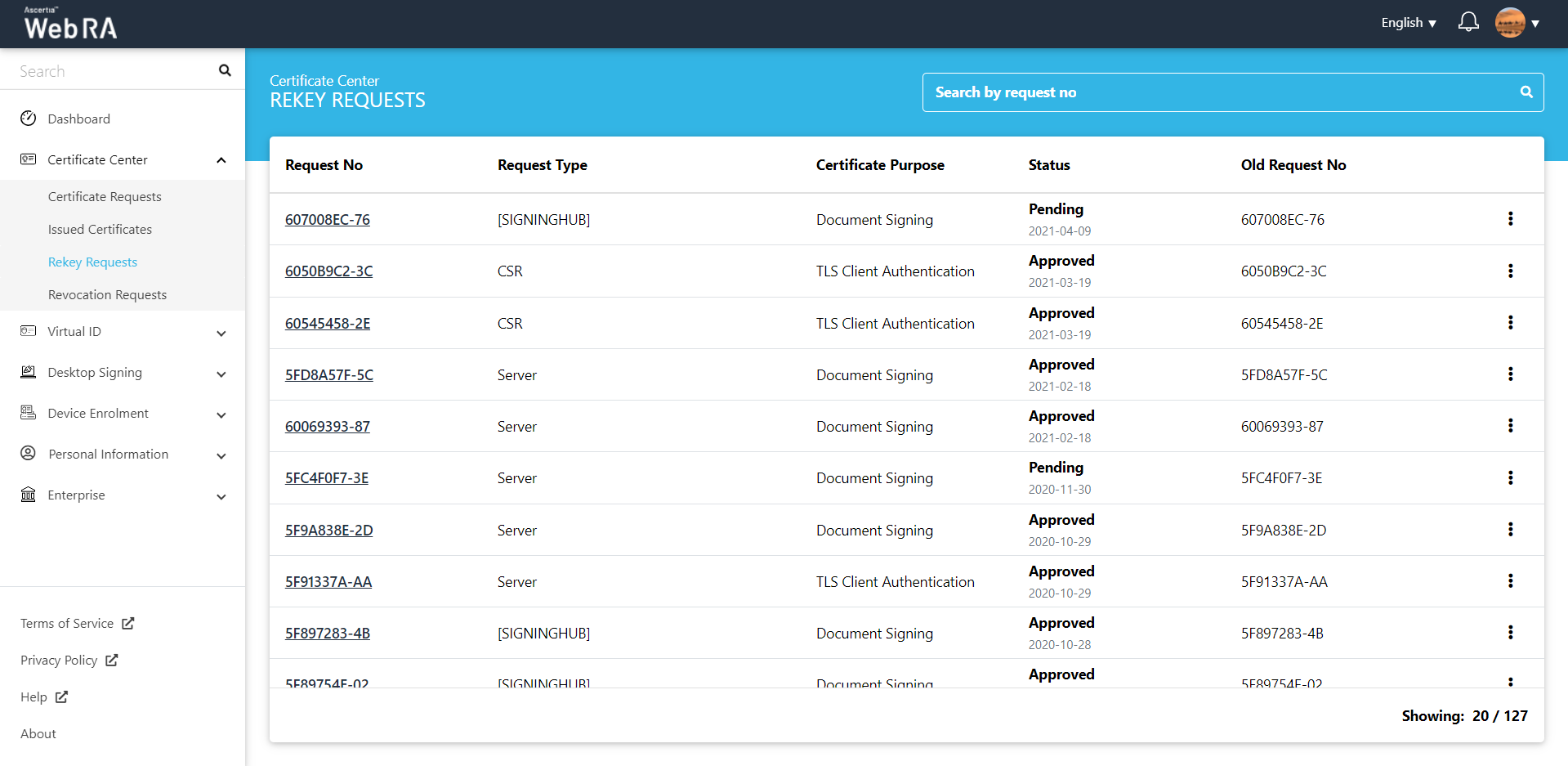 - By clicking on the “Rekey Requests” option from left side menu, user will be able to see all requests of rekey certificates with its status information.