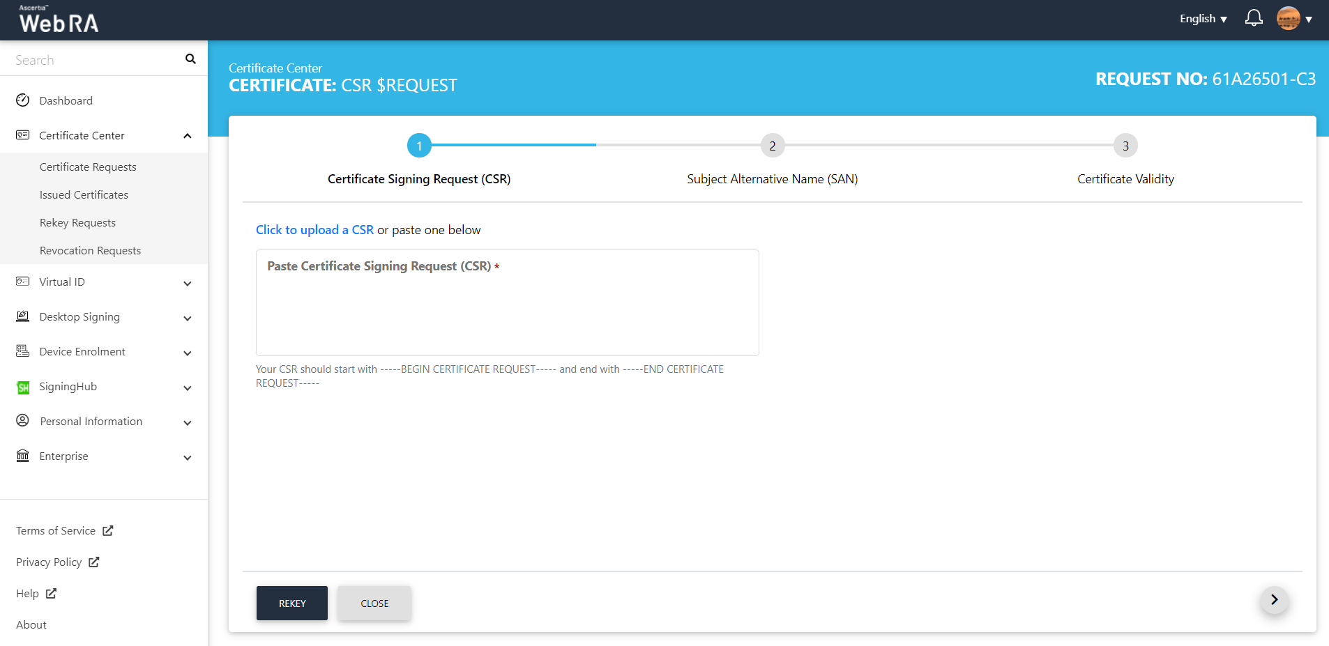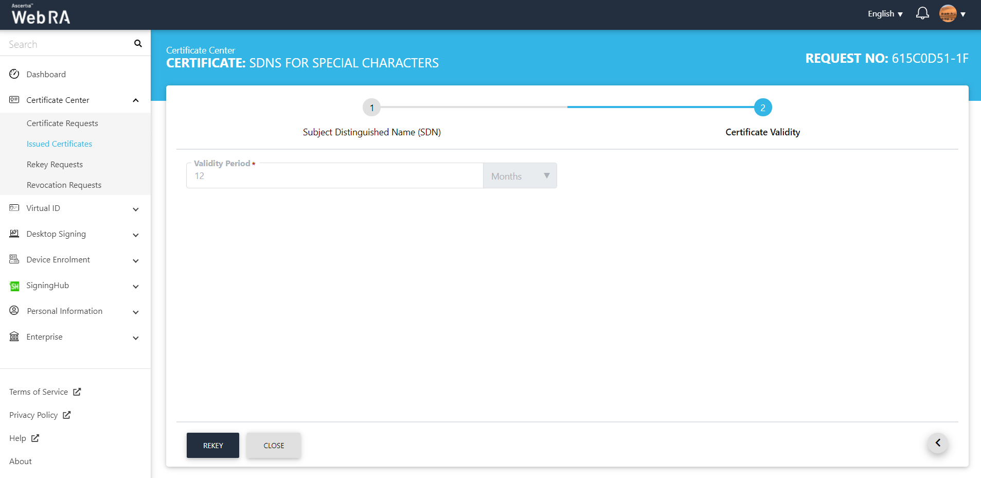 Click on the 'Rekey Certificate' to open a request form from the list of issued certificates.