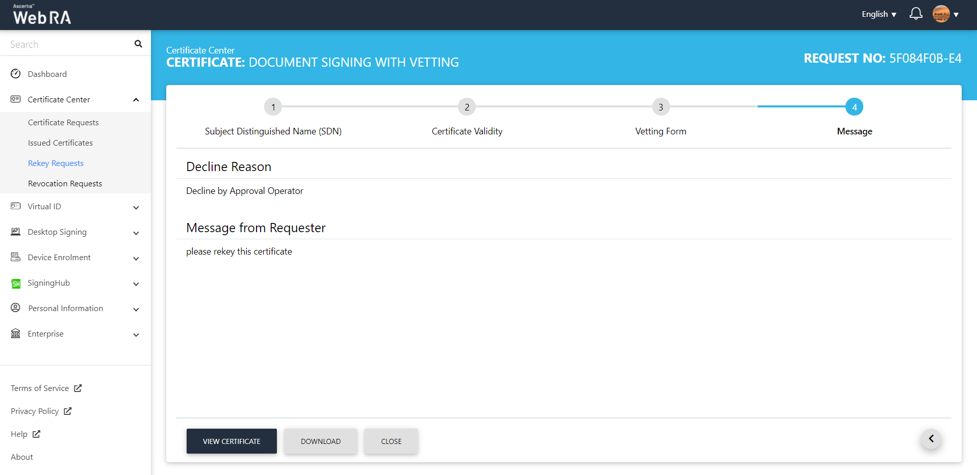 User can see “Message” tab on declined rekey request by clicking on view request option from listing. It will show the reason of decline by administrator.