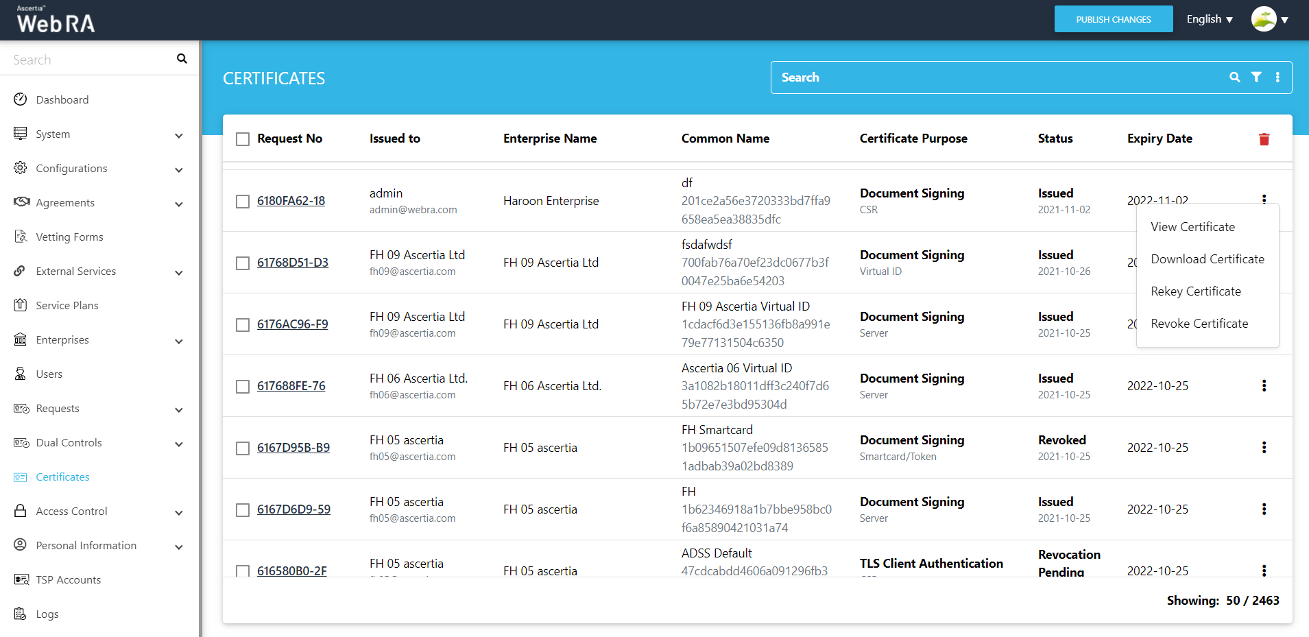 This module is used to display the list of all issued certificates. The Admin and Enterprise administrators can optionally view, download and revoke the certificates for any user considering the following rules: