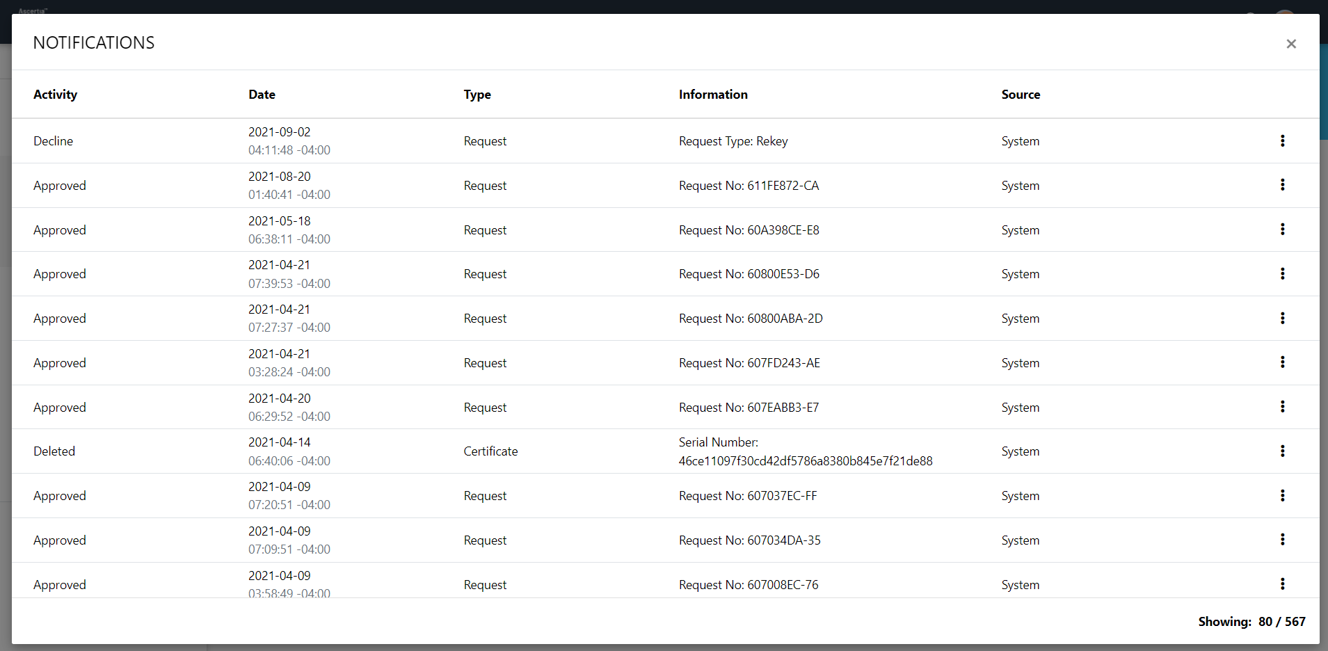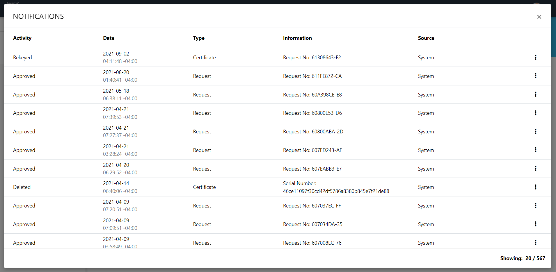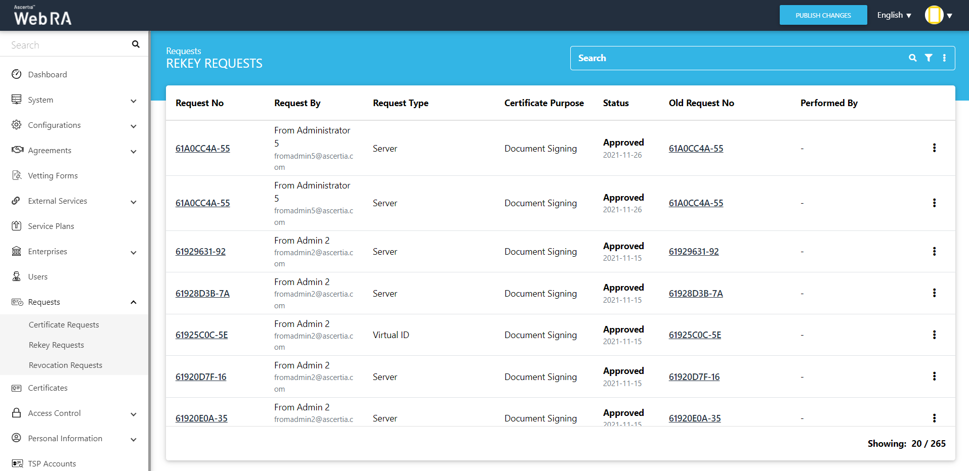 Once an administrator requests approval, the existing certificate will be revoked, the reason of revoking the certificate will be 'Superseded' and the system will generate a new request and certificate. Each rekey request has an 'Old Request Number' in the requests details where the administrator can see the old request and its certificate. The request and request category status will be approved and an approval notification will be sent to the user.