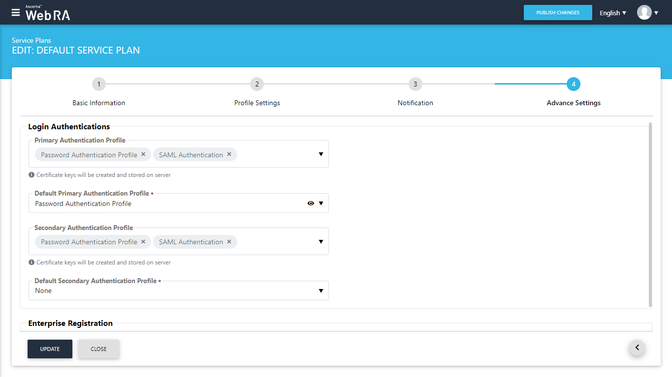 Primary authentication configured as login authentication which lets an enterprise RAO to login on Web RA User's portal and by default one of the available Primary Authentication profiles must be selected. |