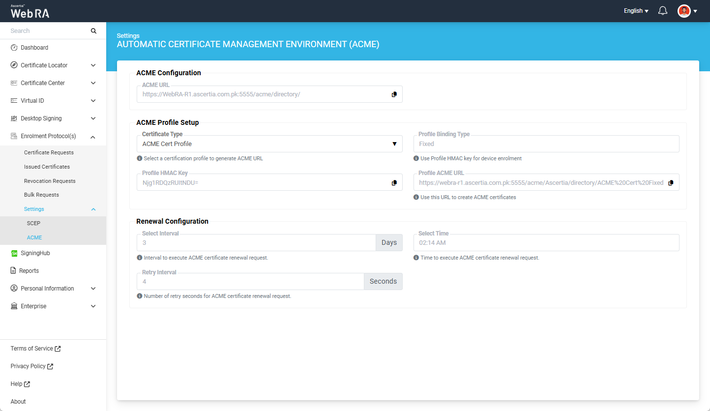 The Profile ACME URL will appear in disabled (read-only) form and is used to create ACME certificates.