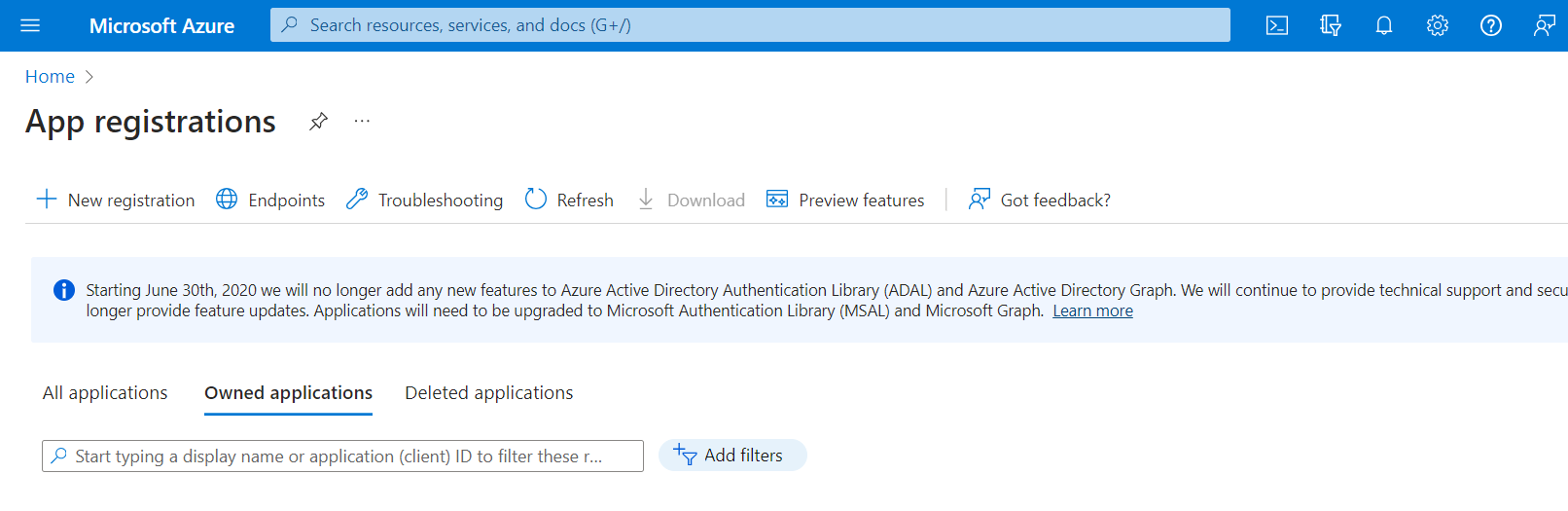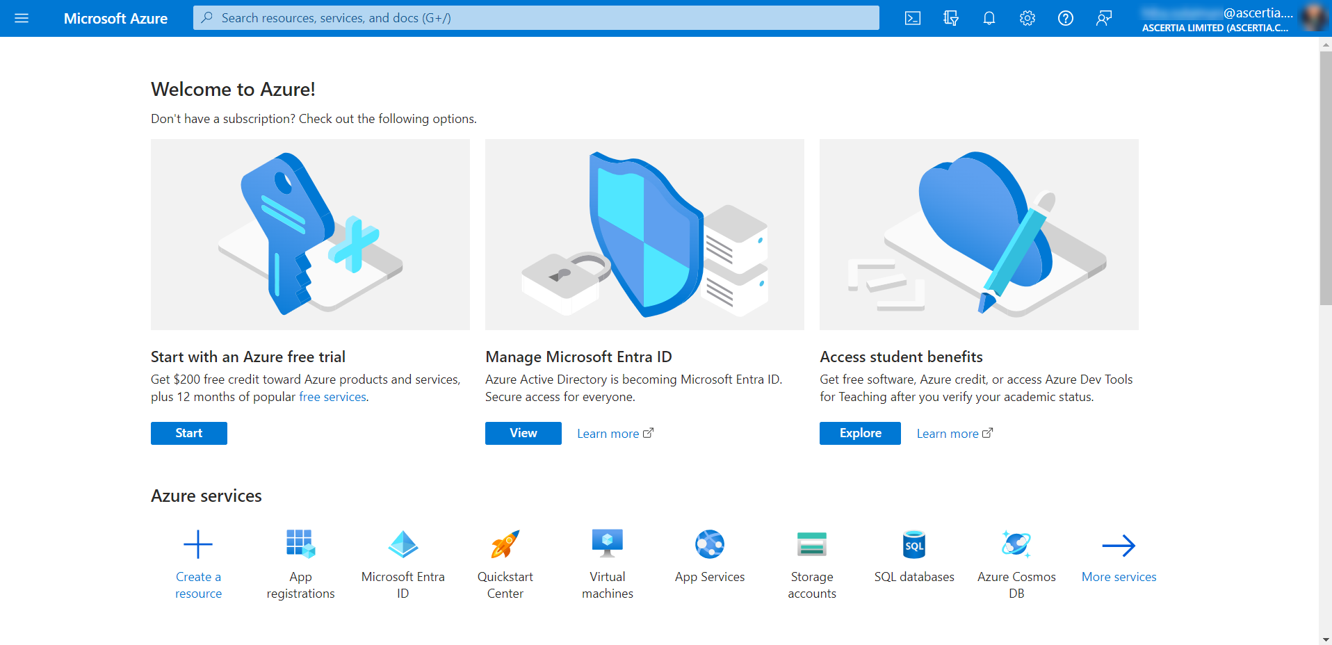 1. The Azure Portal home page will appear. Click App registrations from the Azure services.