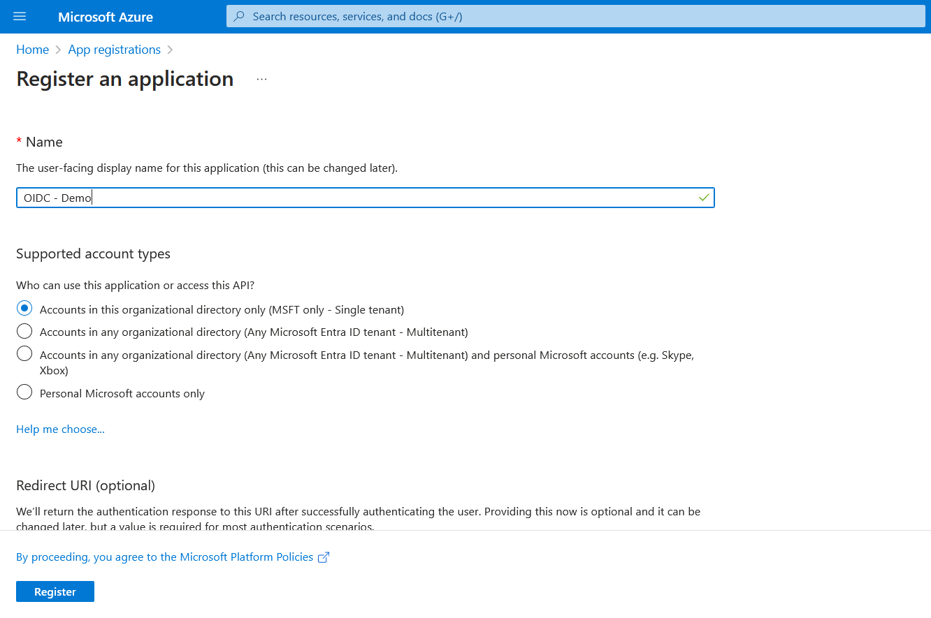 1. Enter the name, select an option from the supported account types, e.g. Accounts in this organizational directory only (MSFT only - Single tenant). Then click Register.