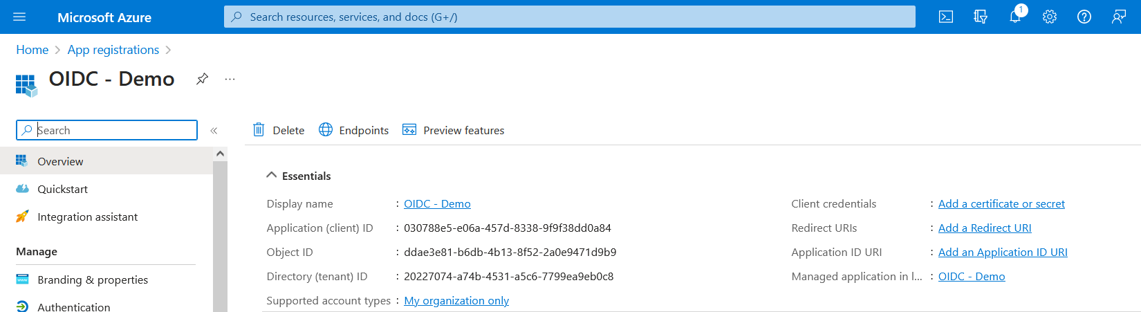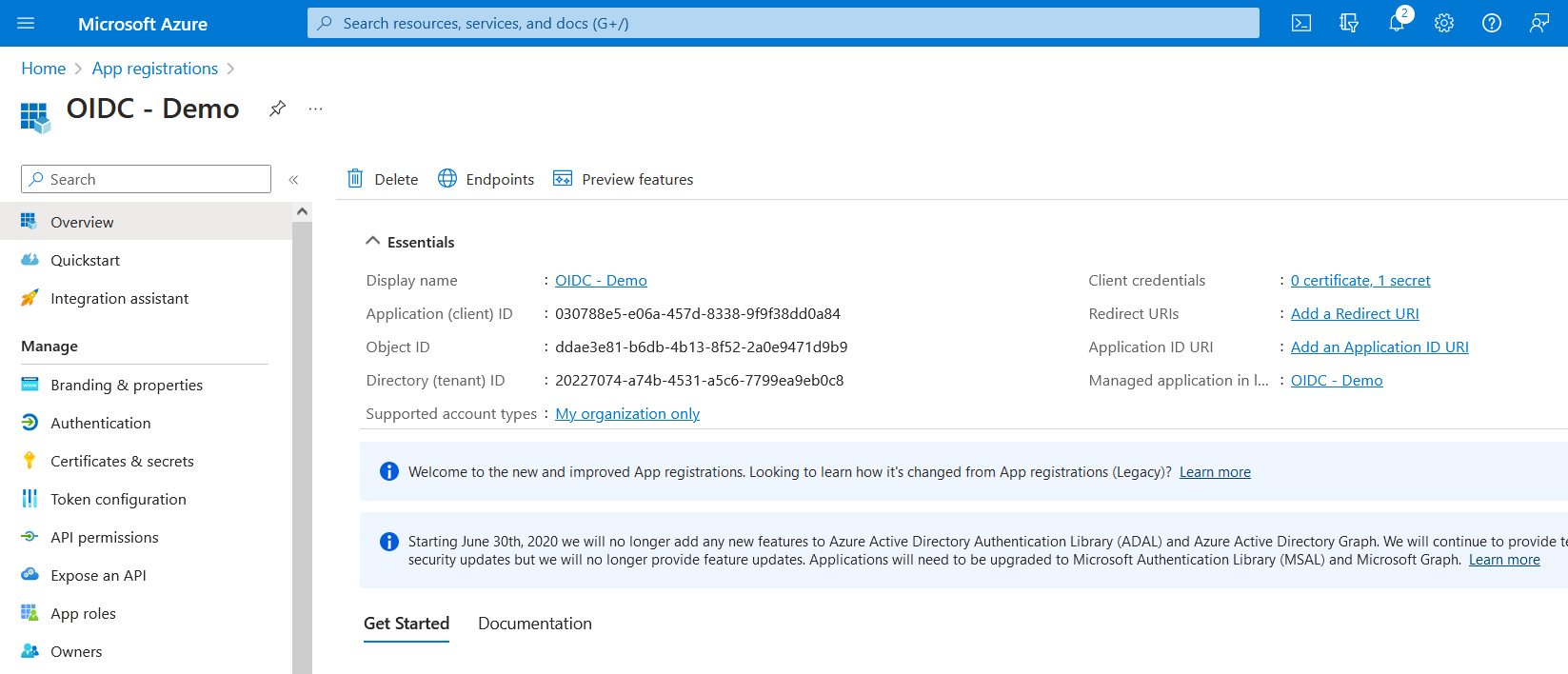 1. Then click Overview and return to the application you created. Then click Endpoints.