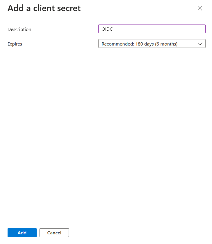 1. At the Add a client secret window, enter the description and expiry. Click Add.