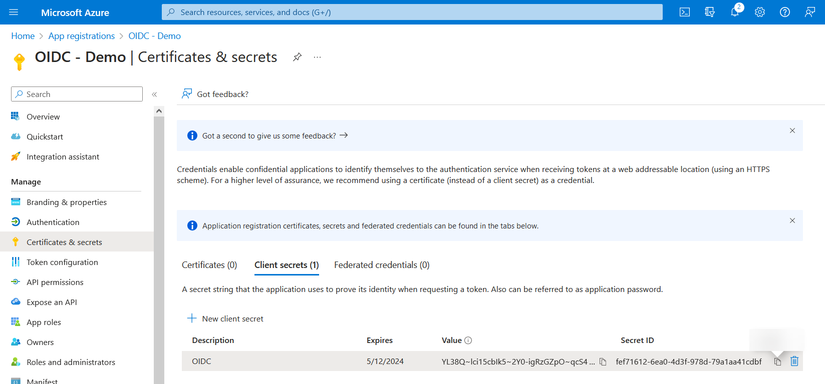1. Once the client secret is created, it will appear in the list. Copy the value and save it for future use. (That is required as the Client Secret in ADSS Web RA's connector).