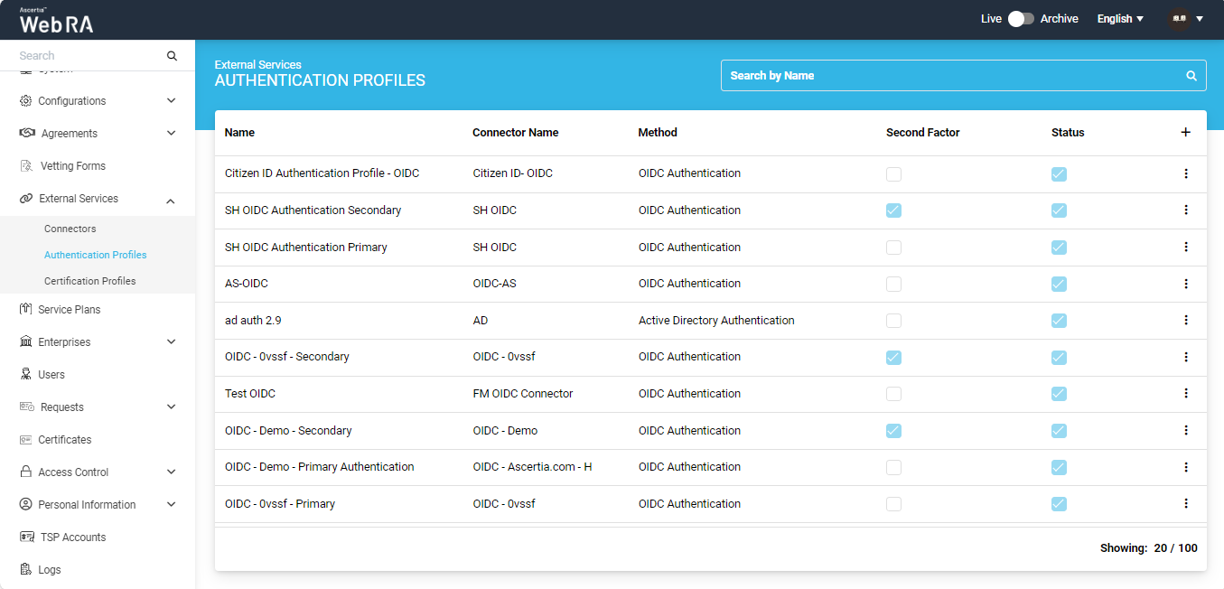 - Expand External Services > Authentication Profiles from the left menu pane, you will be navigated to the listing page.