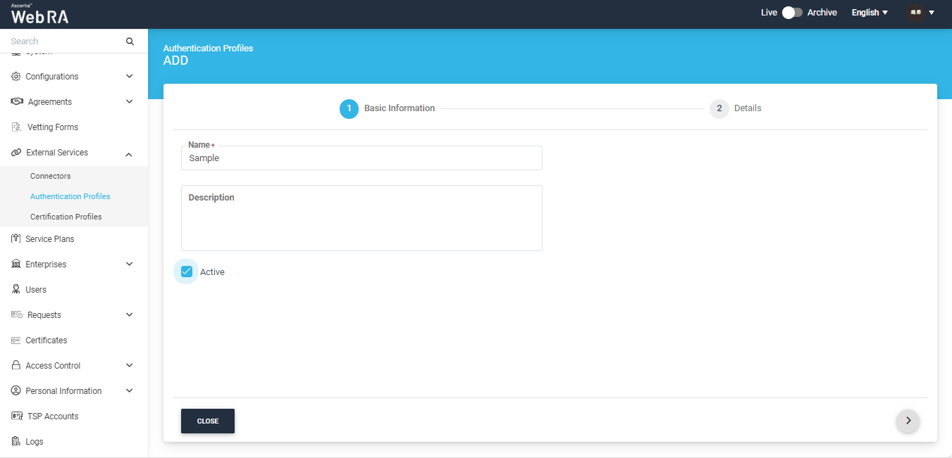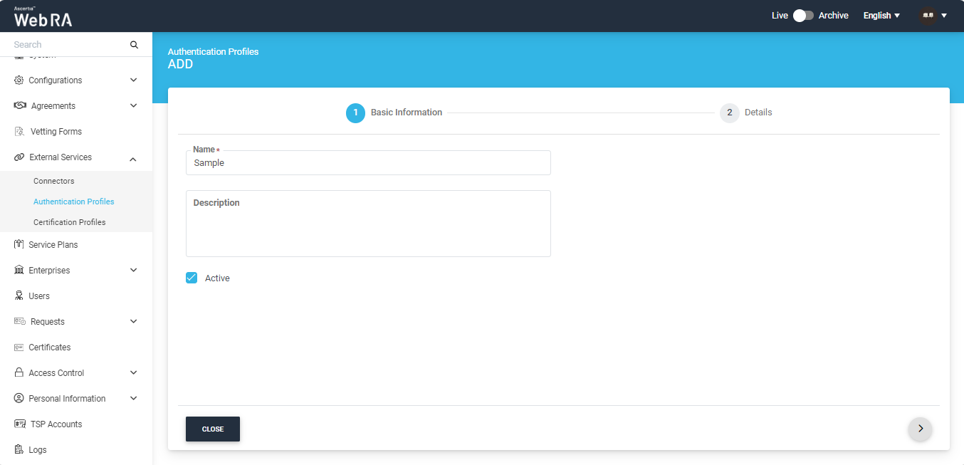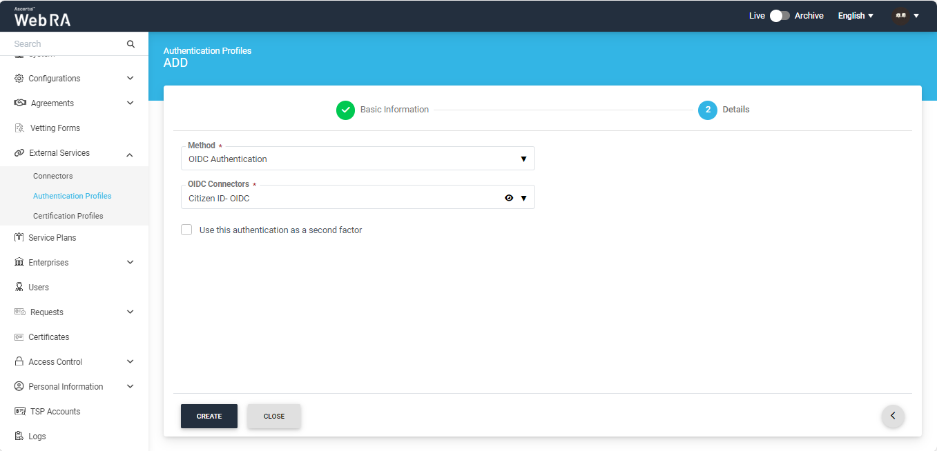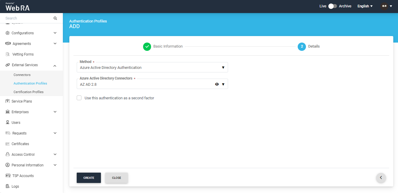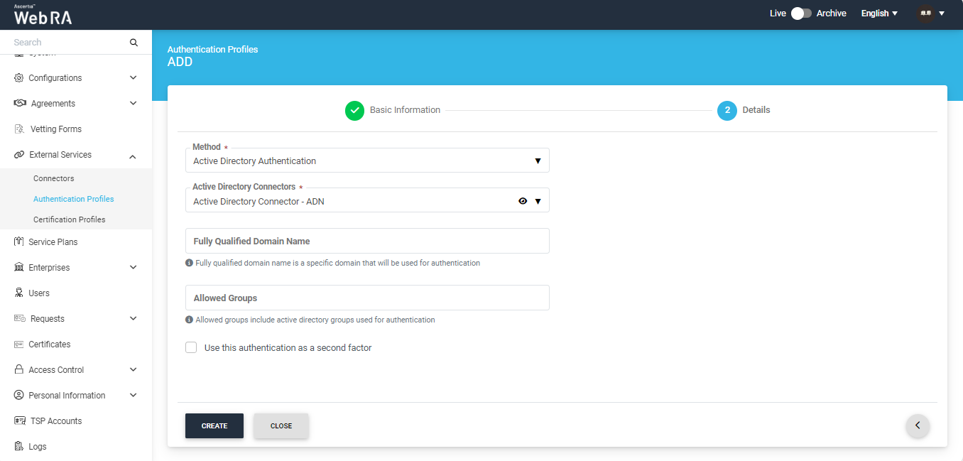 - Primary Authentication - It is used for an authorized access to login into ADSS Web RA user portal. Generally set in the Service Plans > Login Authentications under the Advance Settings tab.