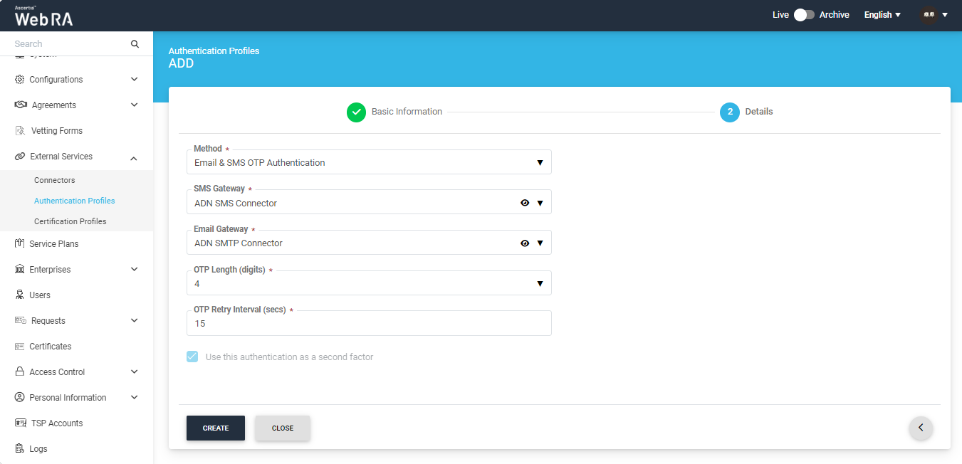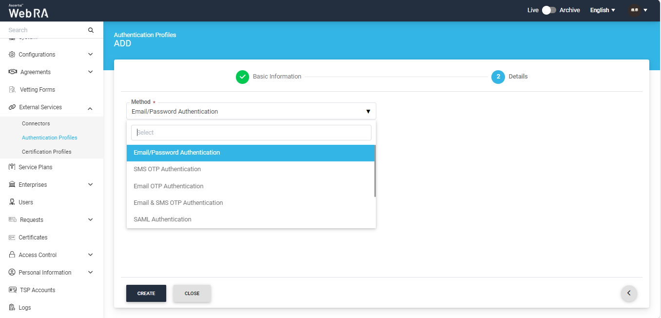icon on top right. Provide name for the authentication profile, and select authentication method on next screen. On selection of Email/Password Authentication, no option appears to select secondary authentication. If the authentication profile configured under Service Plan is only set as primary, i.e. email/password authentication then it will work same as default ADSS Web RA authentication where user has to provide his email and password credentials. - You can also create an OTP (One Time Password) based authentication, using the following options: