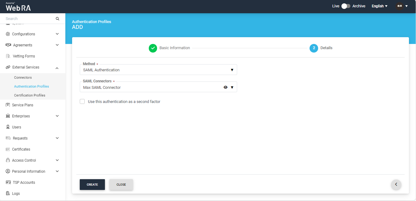 - Secondary Authentication - It is used for certificate requests creation, renewal and revocation. Generally set in the Certification Profiles under the Authentications tab.