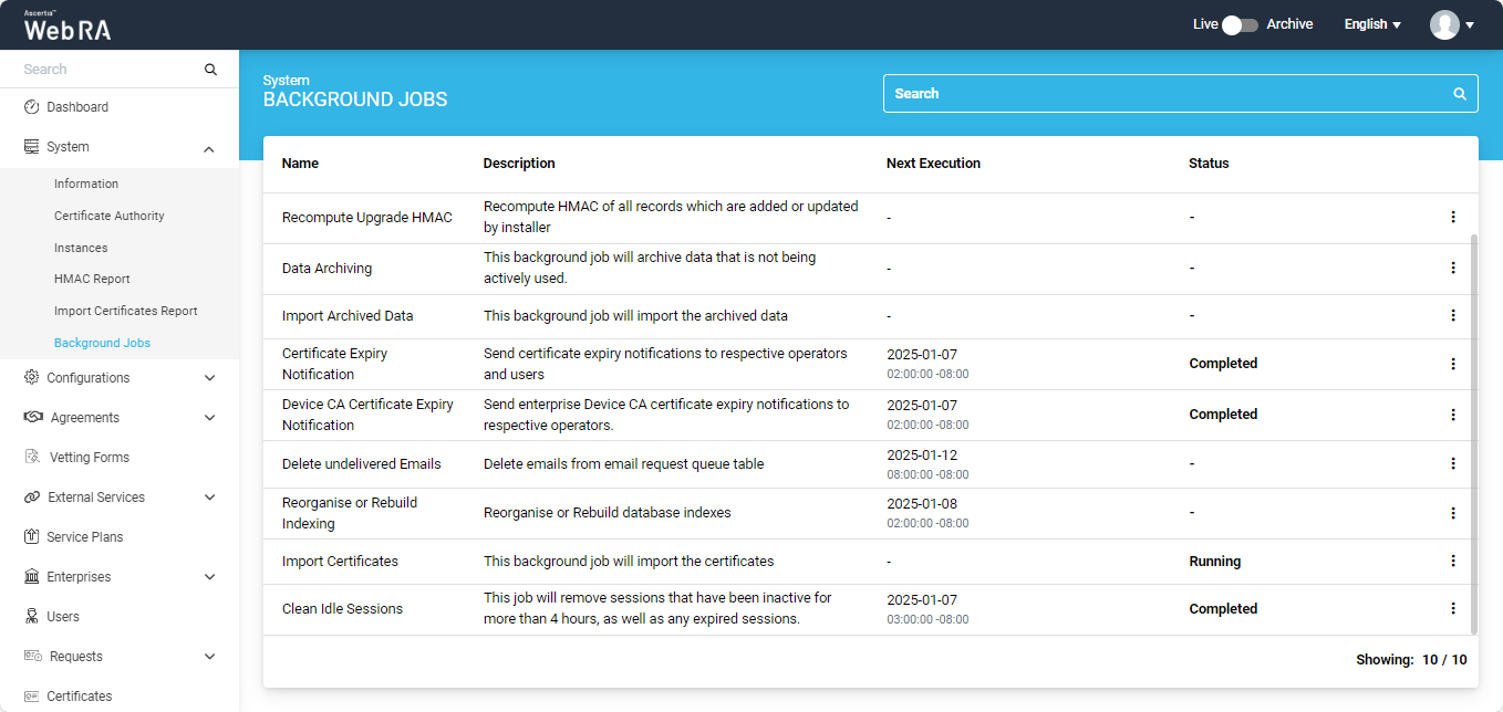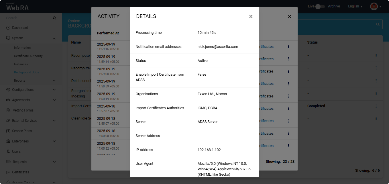This job will import the certificates from the ADSS, and a report will be generated. The report will then be sent to the email address(es) specified when scheduling the Import Certificates background job.
