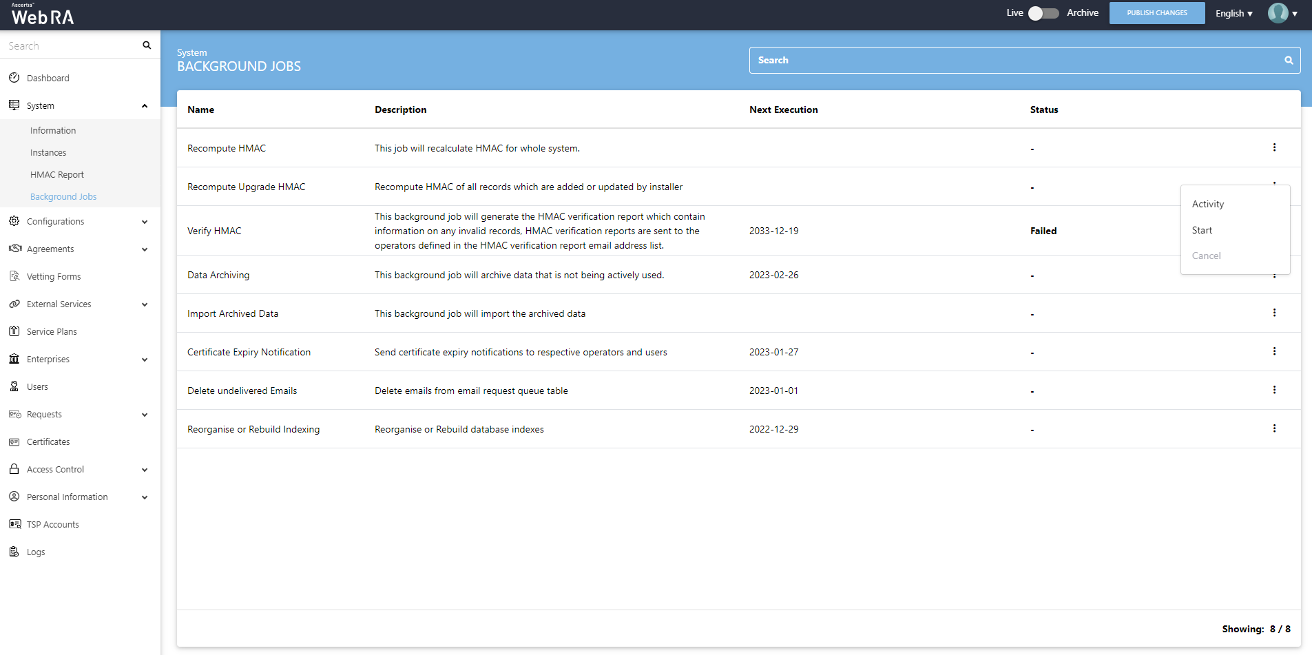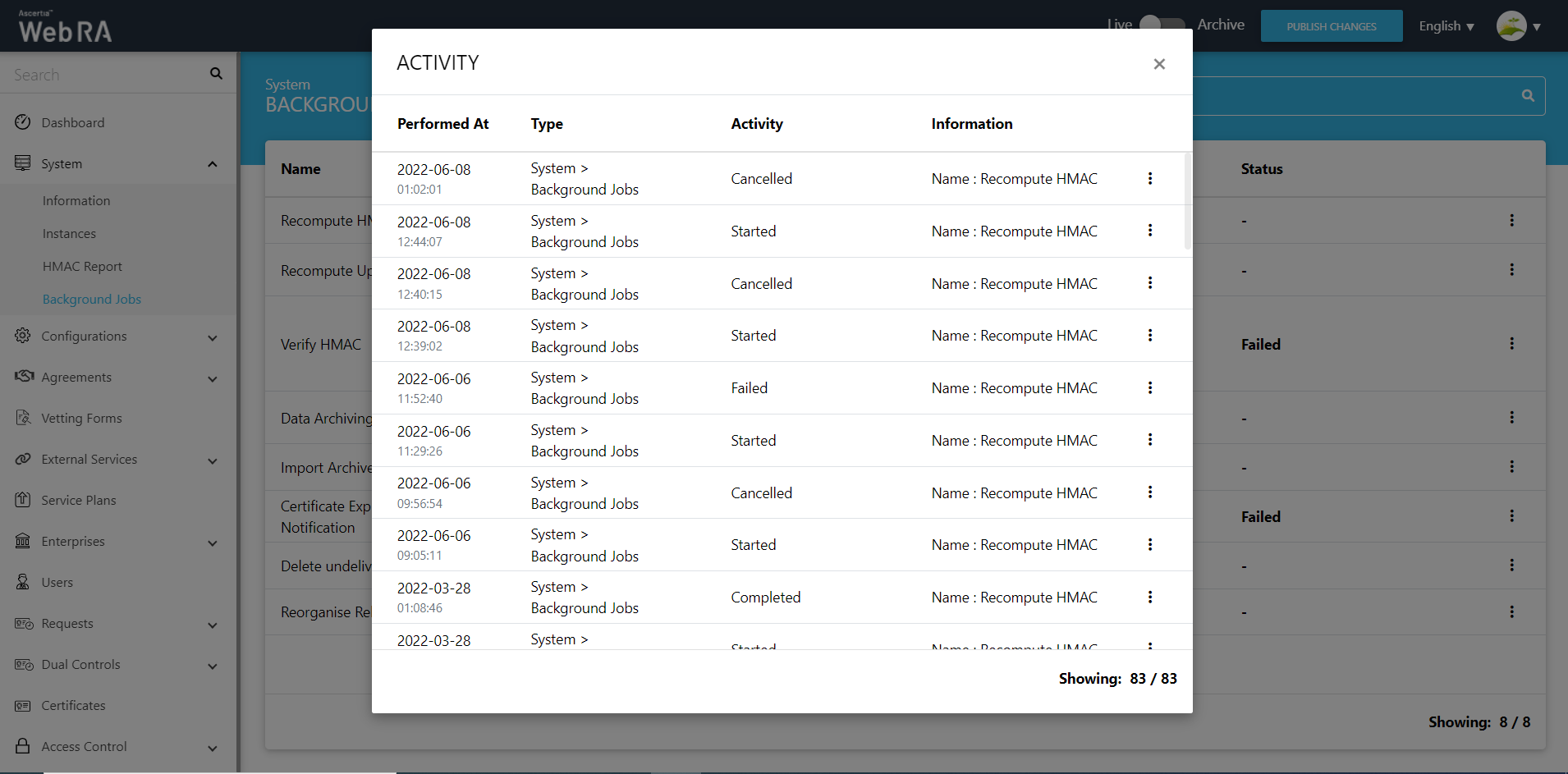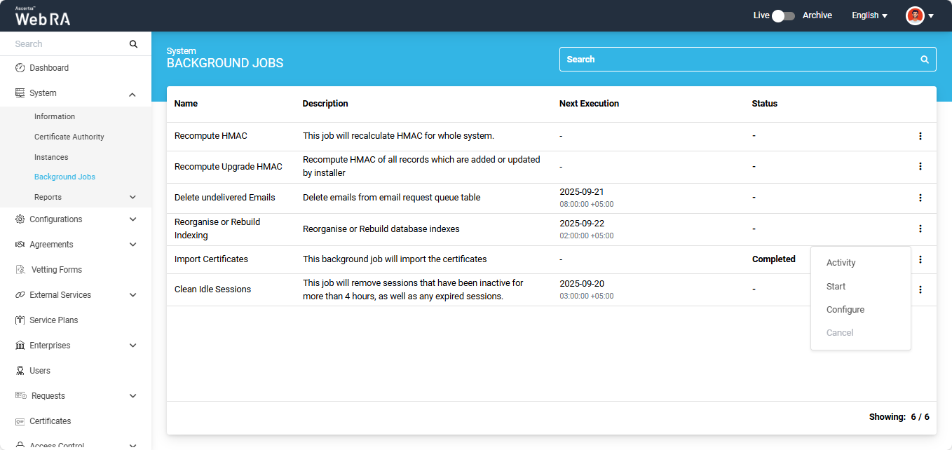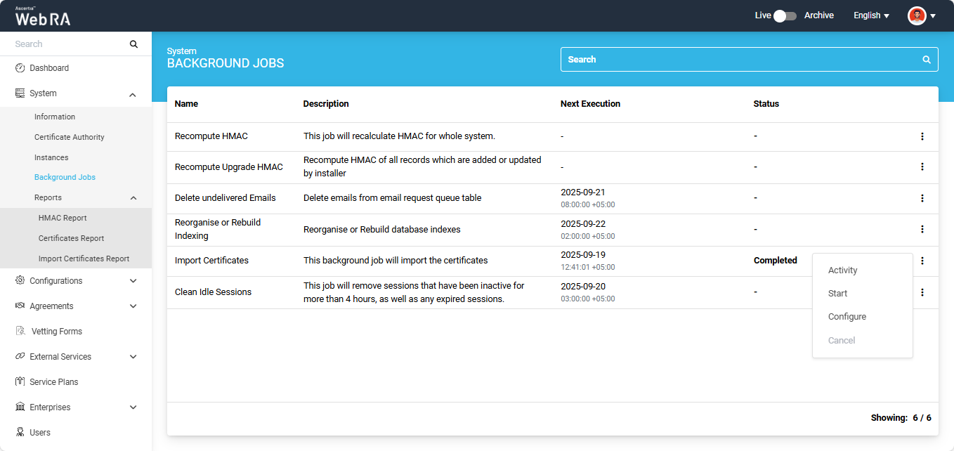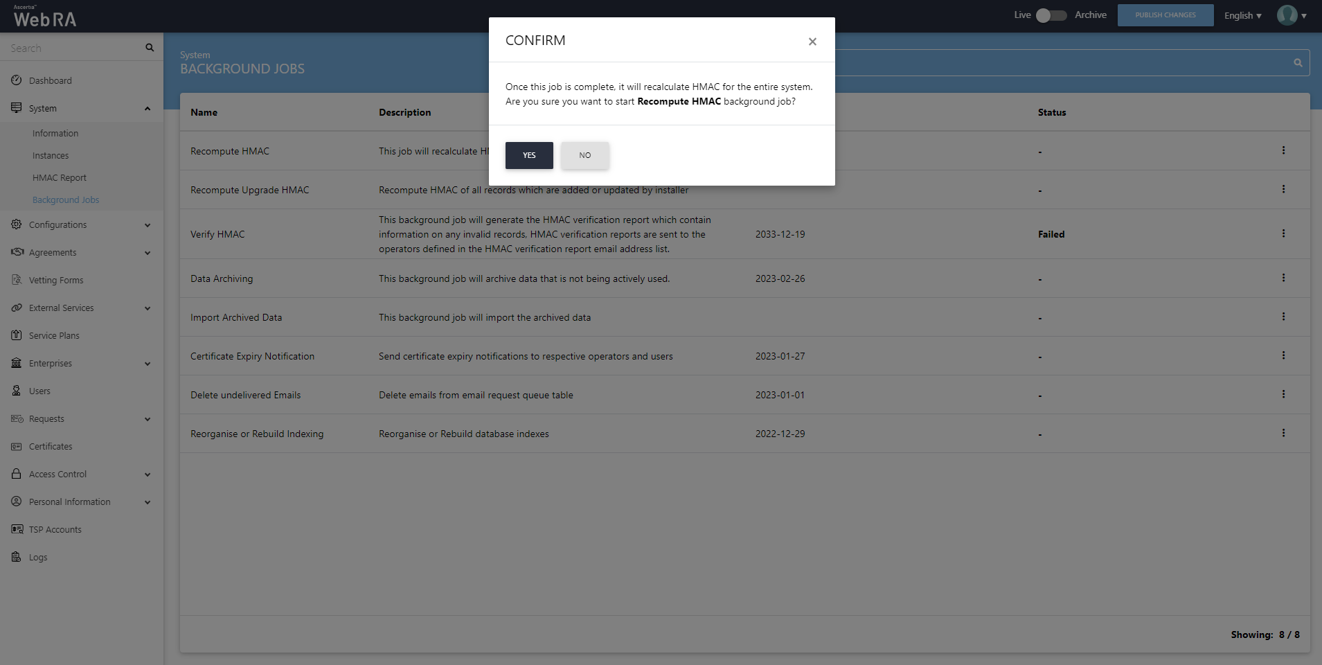 When an upgrade is made in the ADSS Web RA application, and new records are added in the database through the upgrade script, it requires running a recompute upgrade HMAC job. This job is required for computing HMAC for the newly added records only. An administrator can start a recompute upgrade HMAC job simply by clicking on the button.