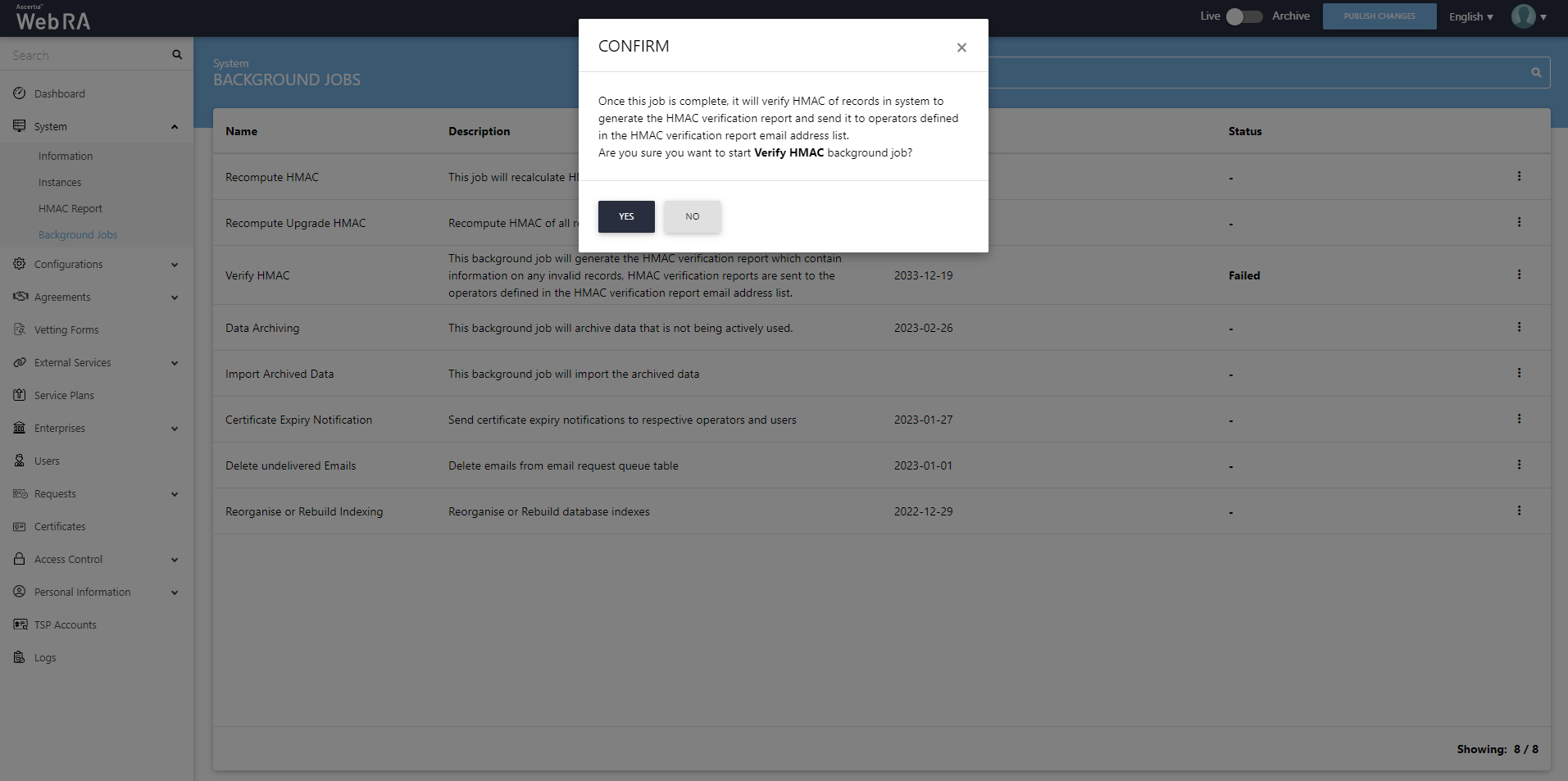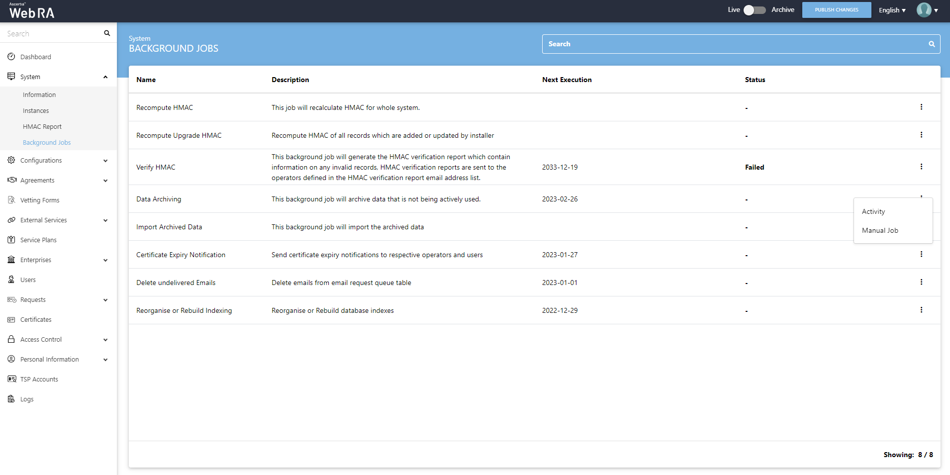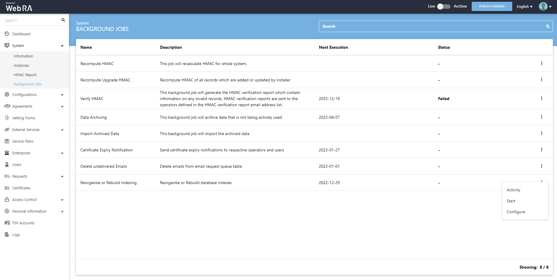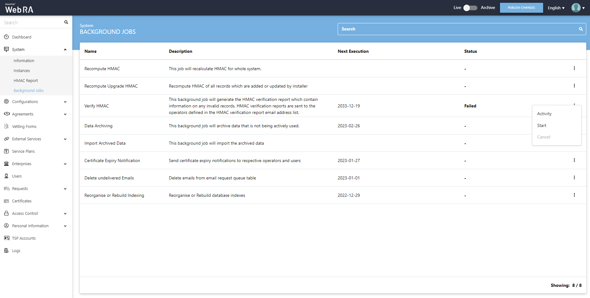 When an upgrade is made in the ADSS Web RA application, and new records are added in the database through the upgrade script, it requires running a recompute upgrade HMAC job. This job is required for computing HMAC for the newly added records only. An administrator can start a recompute upgrade HMAC job simply by clicking on the button.