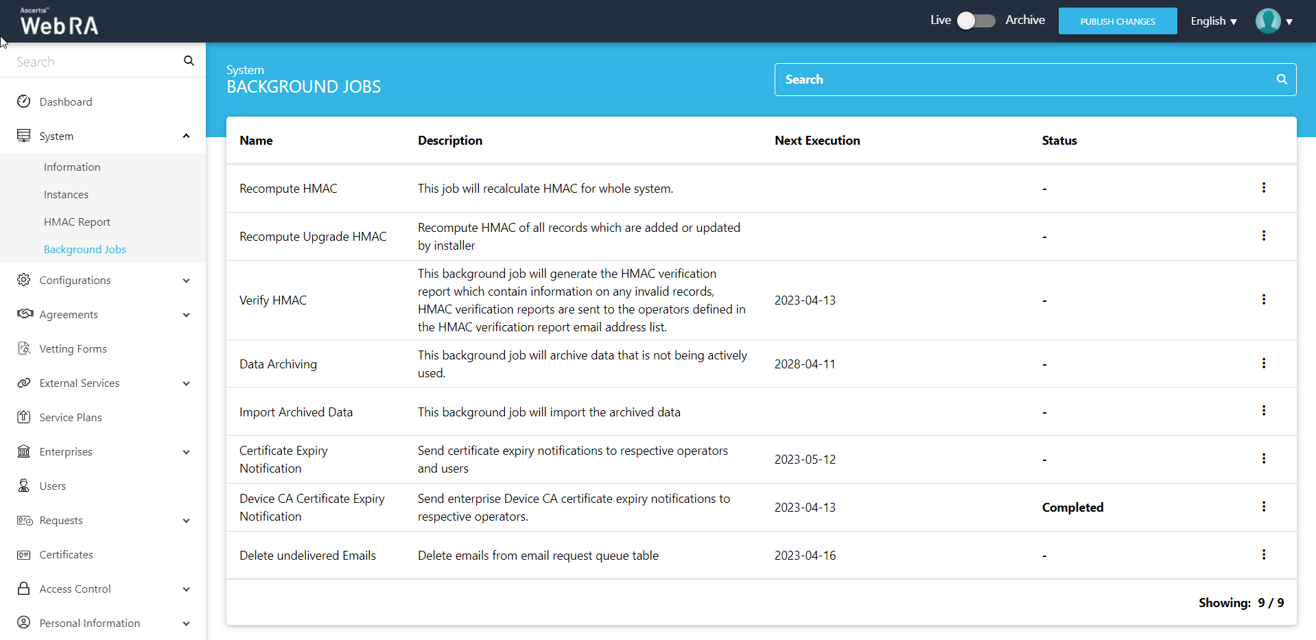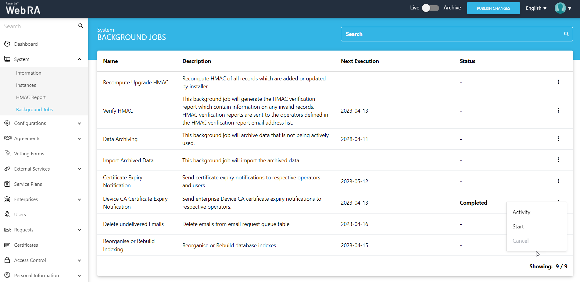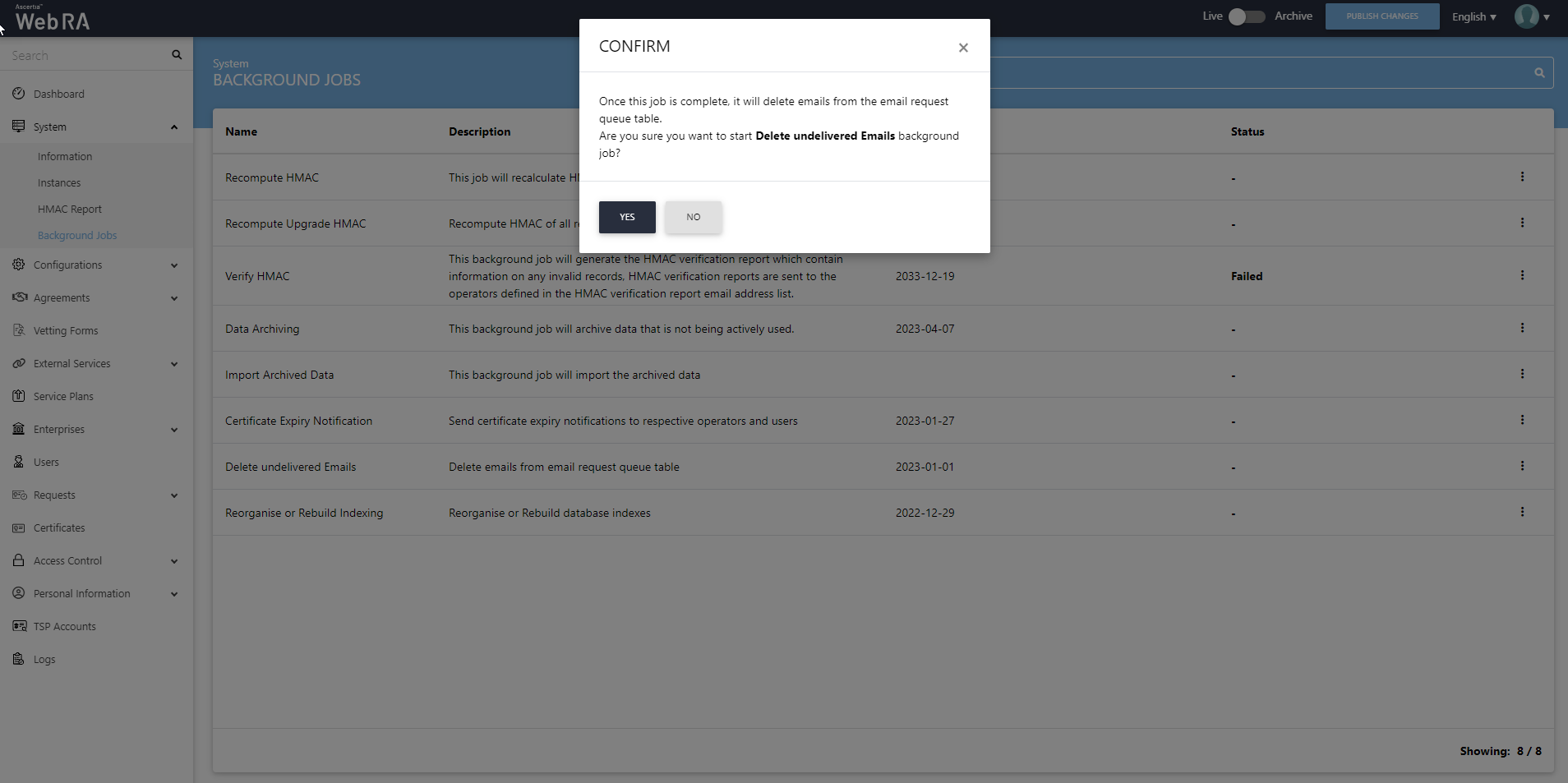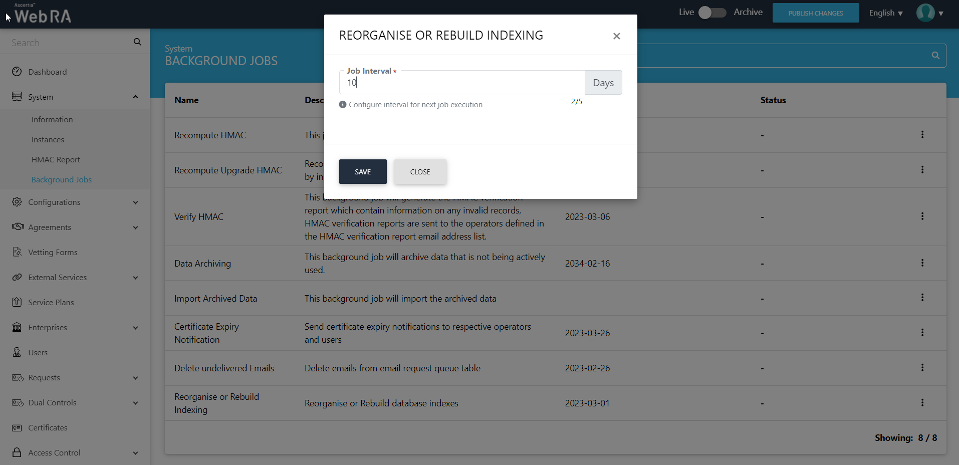 When an upgrade is made in the ADSS Web RA application, and new records are added in the database through the upgrade script, it requires running a recompute upgrade HMAC job. This job is required for computing HMAC for the newly added records only. An administrator can start a recompute upgrade HMAC job simply by clicking on the button.