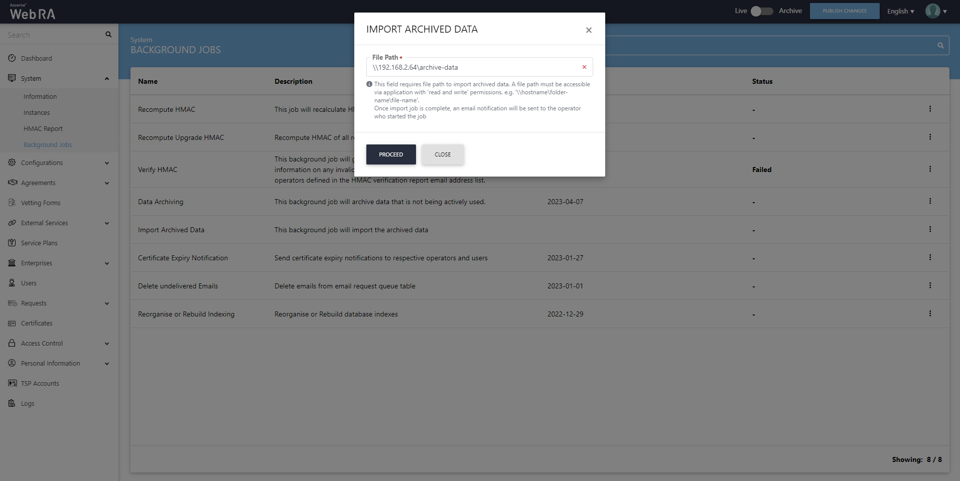 This job automatically imports the archived data. Once imported, can be viewed in the Archive Mode (with the help of the archival toggle button).