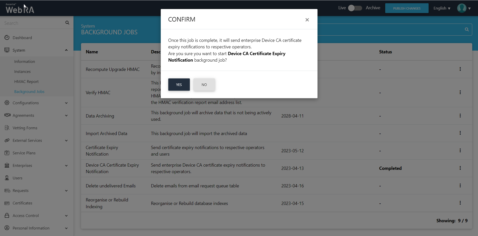 After selecting the start option, the system will display a confirmation dialog. Click ‘Yes’ to proceed.