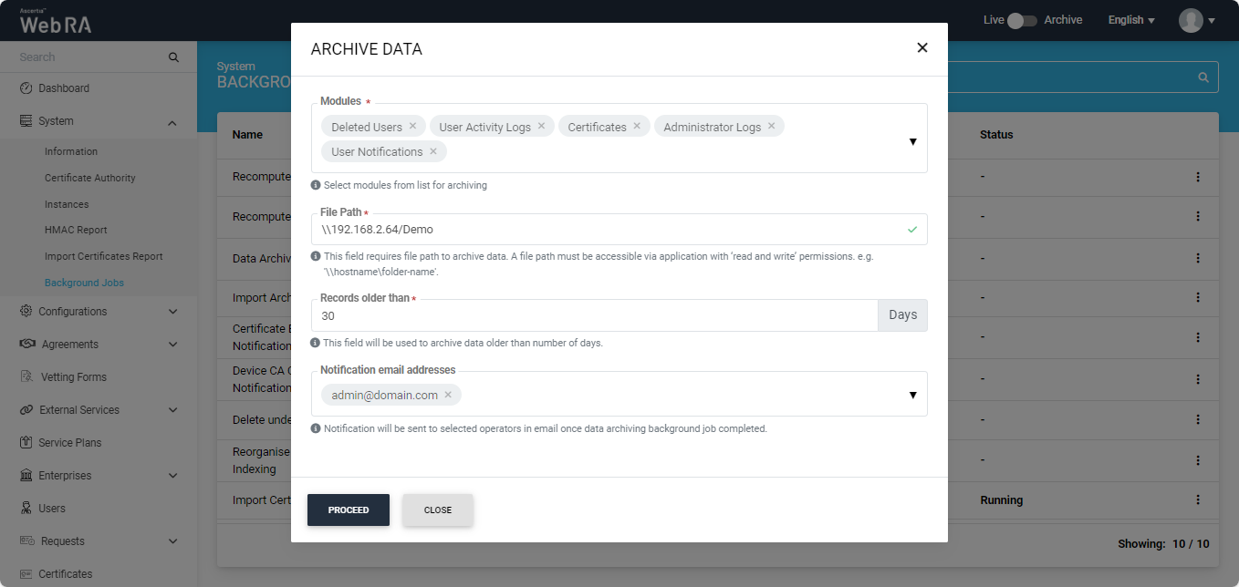 Select email addresses of the operators that should be notified when data archiving background job is completed