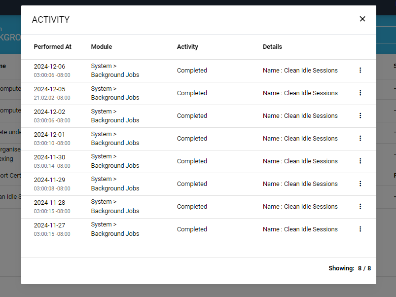 The system will create and save an activity entry whenever a background job is executed. All past activities can be seen from the ‘Activity’ dialog. To access the dialog, click the three-dot  icon and select the ‘Activity’ option.