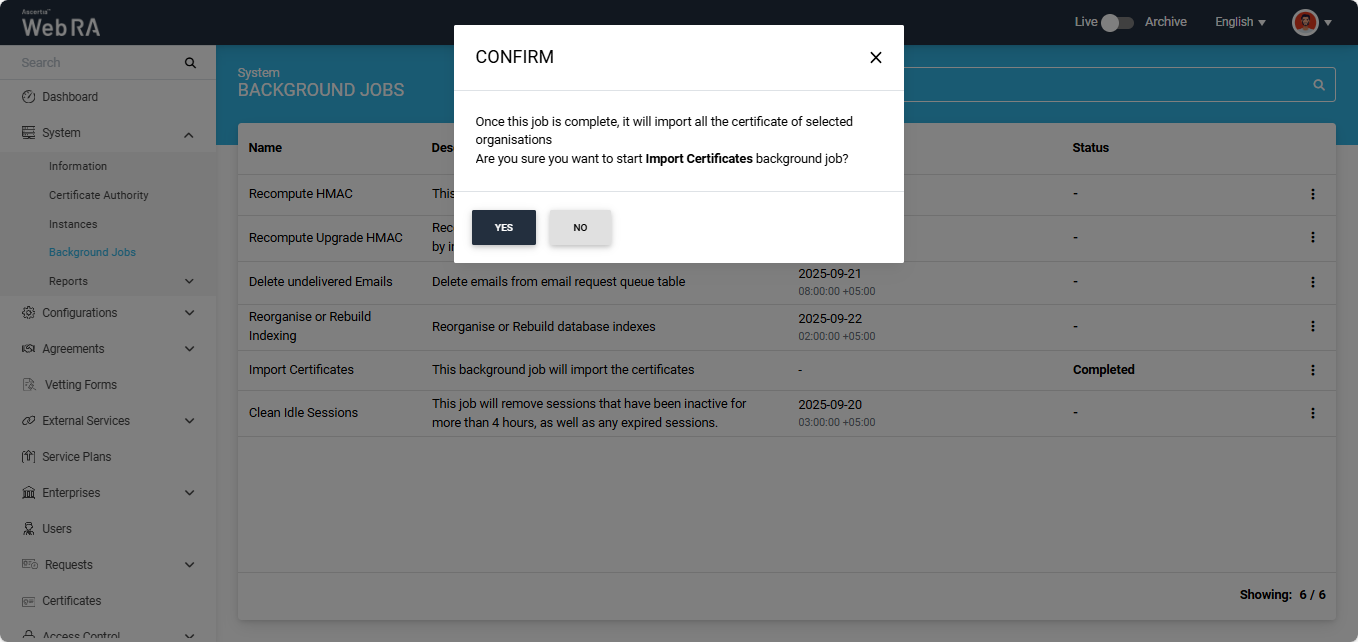 The administrator has the option to manually start the import certificates job as well.