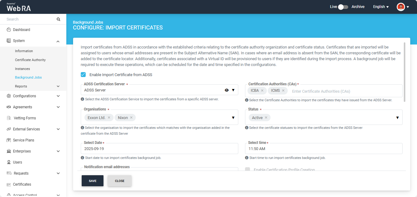 This background job will import the certificates from the ADSS Server and generate an import certificates report. The report will then be shared on the email address(es) specified when scheduling the ‘Import Certificates’ background job.