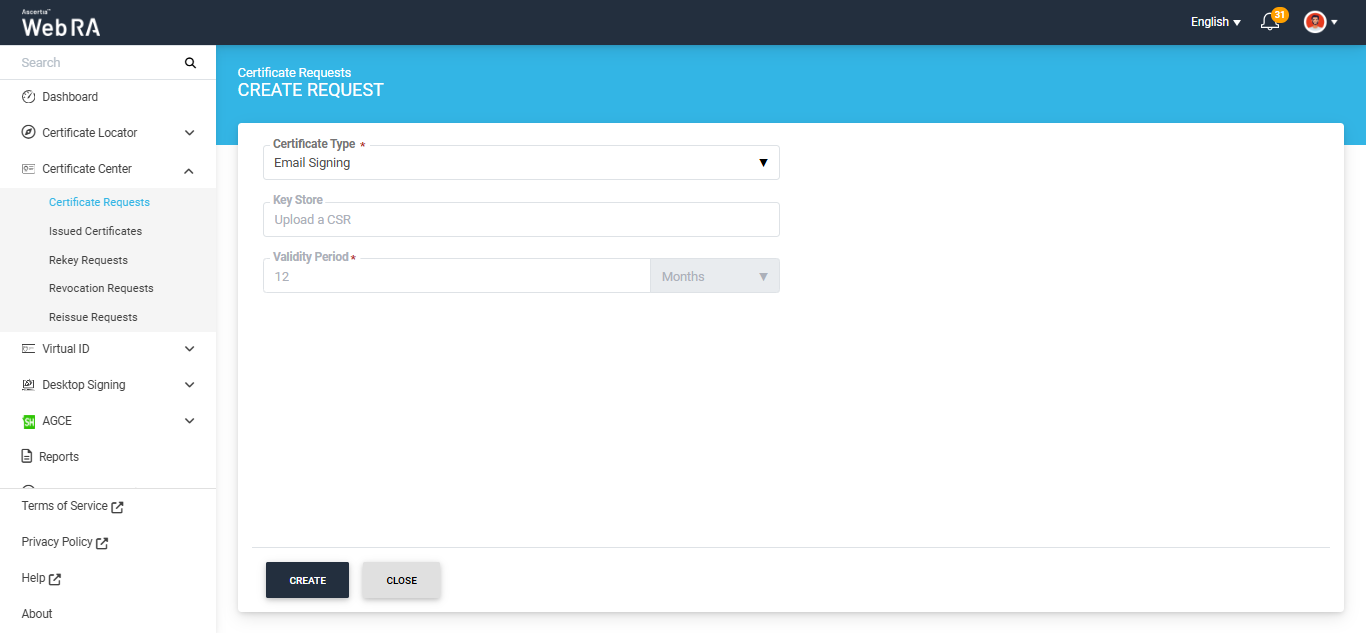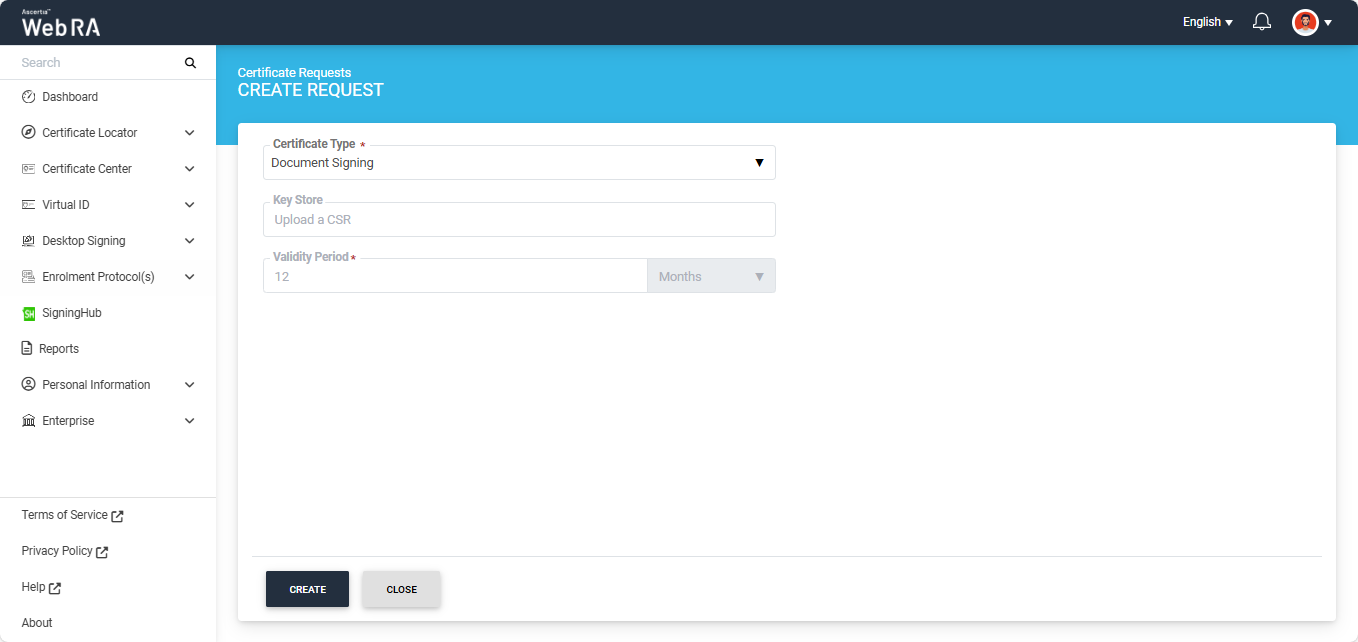 On this screen, select the ‘Certificate Type’ from the given dropdown field and click ‘Create’.