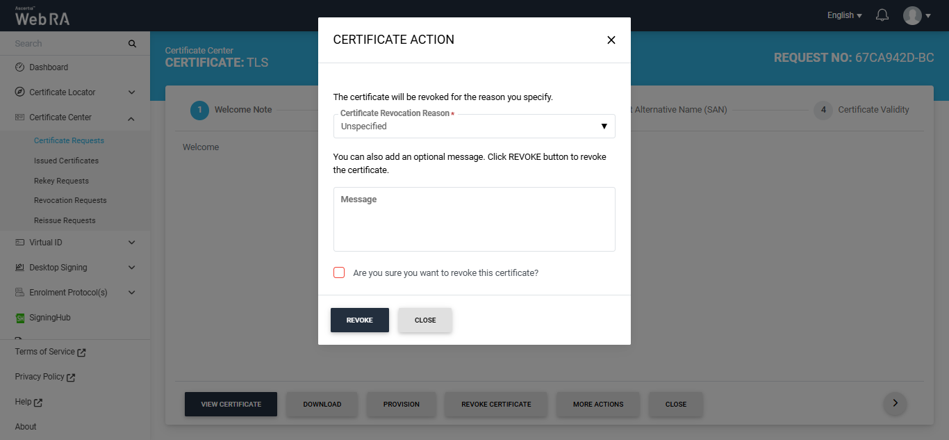 When you click the 'Revoke Certificate' button, the 'Certificate Action' screen appears. On this screen, you must select a reason for revoking the certificate from the 'Certificate Revocation Reason' dropdown and, if required, a message in the optional message box.