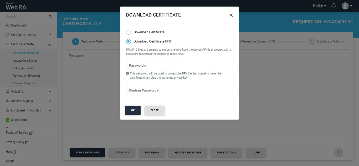 If you click on the 'Download Certificate PFX' radio button, the dialog will display Password and Confirm Password fields. Type in the required password and click 'OK'.