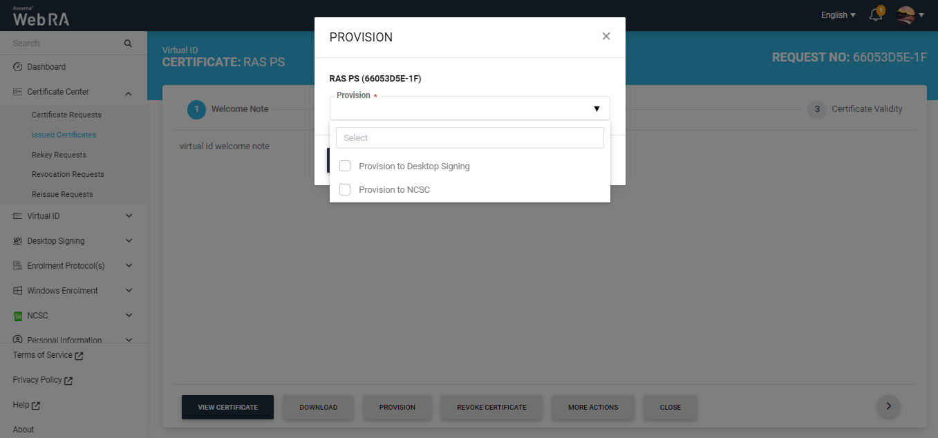 Choose the required option from the 'Provision' dropdown and click the Provision button. The certificate will then be provisioned.