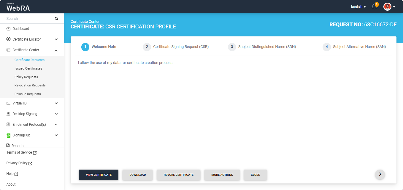 Note: The welcome note will only appear during the creation of a certificate request if the operator has added customised request notes in the enterprise that the user belongs to. For more details, navigate to Request Notes.