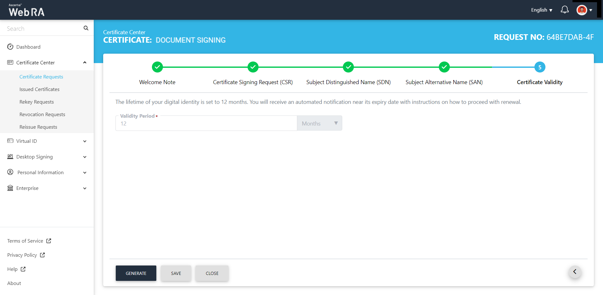 The validity period will appear in the disabled form. Click 'Generate' to create the certificate.