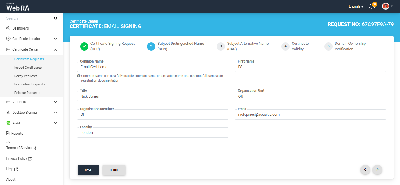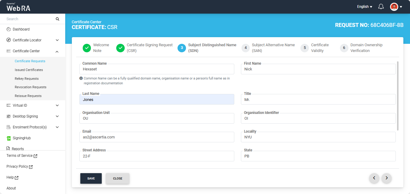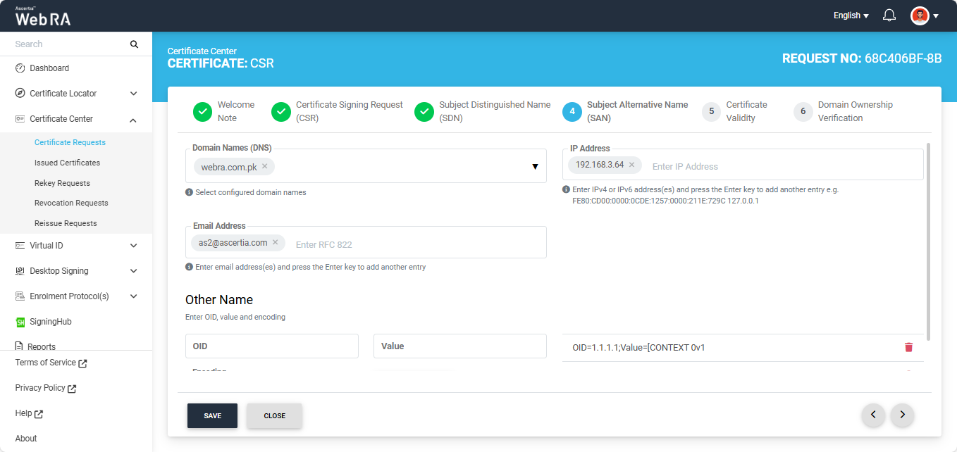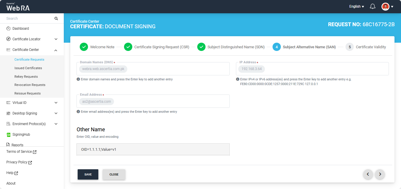 - When a user creates a new certificate request, the SDNs and SANs will be rendered as configured in the certification profile and its values will be auto-filled from the certificate details.