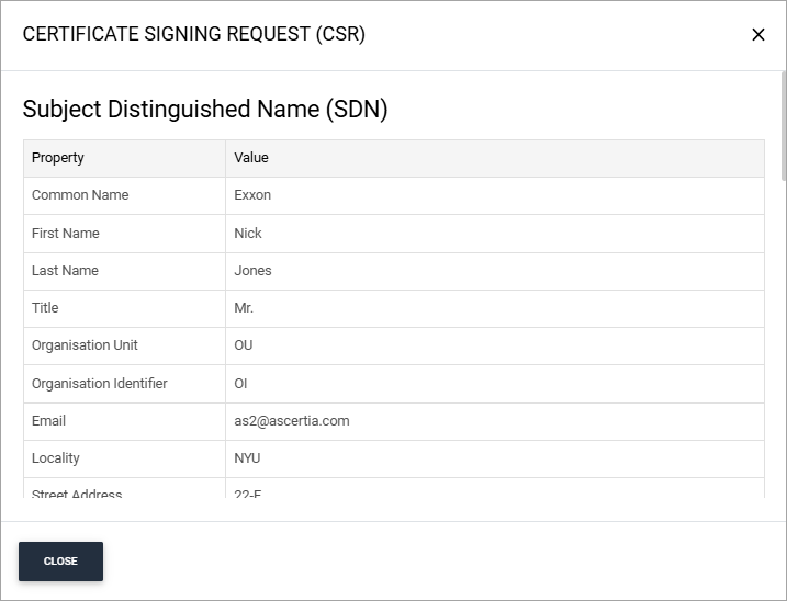 You can click on the eye icon to view the details of the CSR. The details will appear in a dialog as displayed below:
