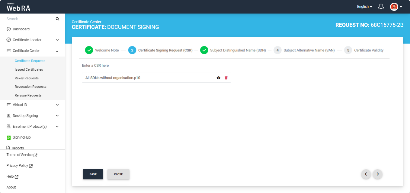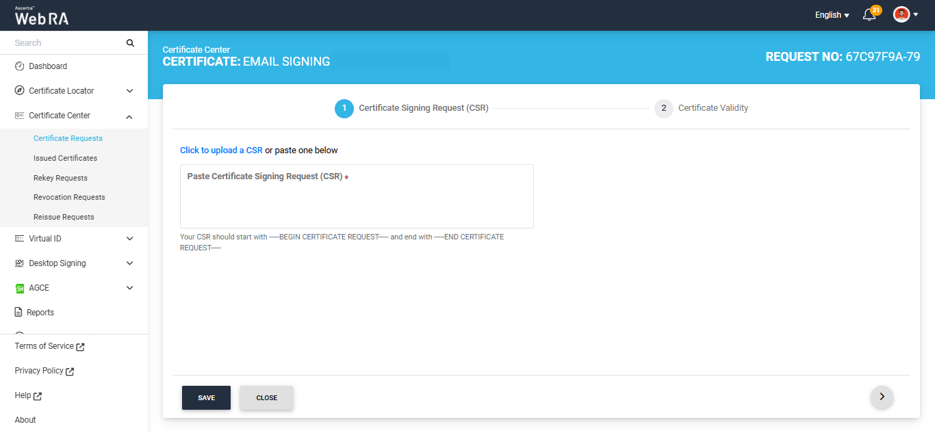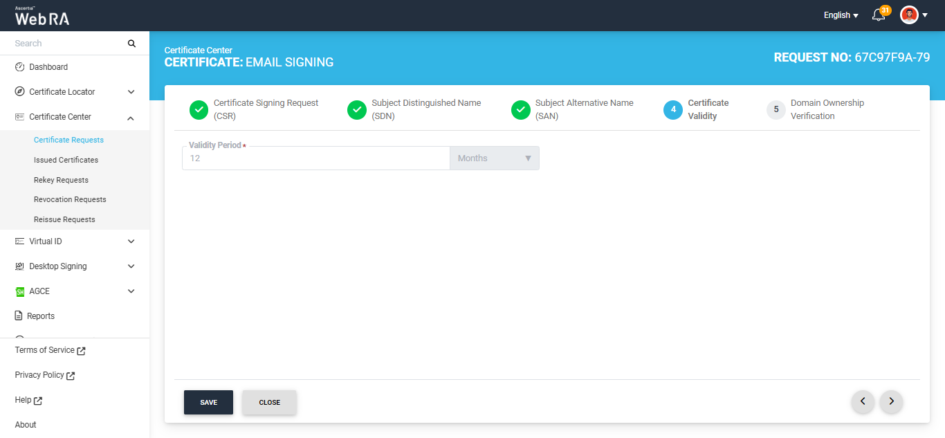 In the web portal, expand the ‘Certificate Center’ tab from the left menu pane and click on the ‘Certificate Requests’ option.