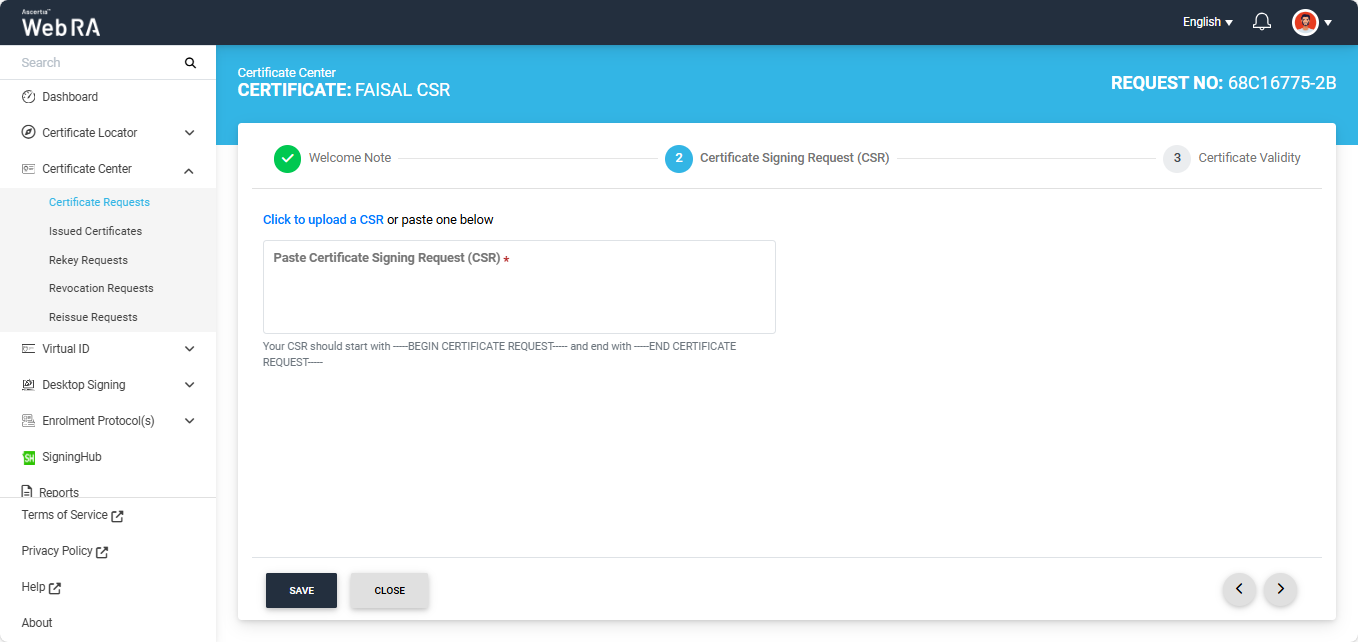 Once you agree to the welcome note and click Next, the upload CSR screen will appear. Here, upload or paste a CSR in the respective box.