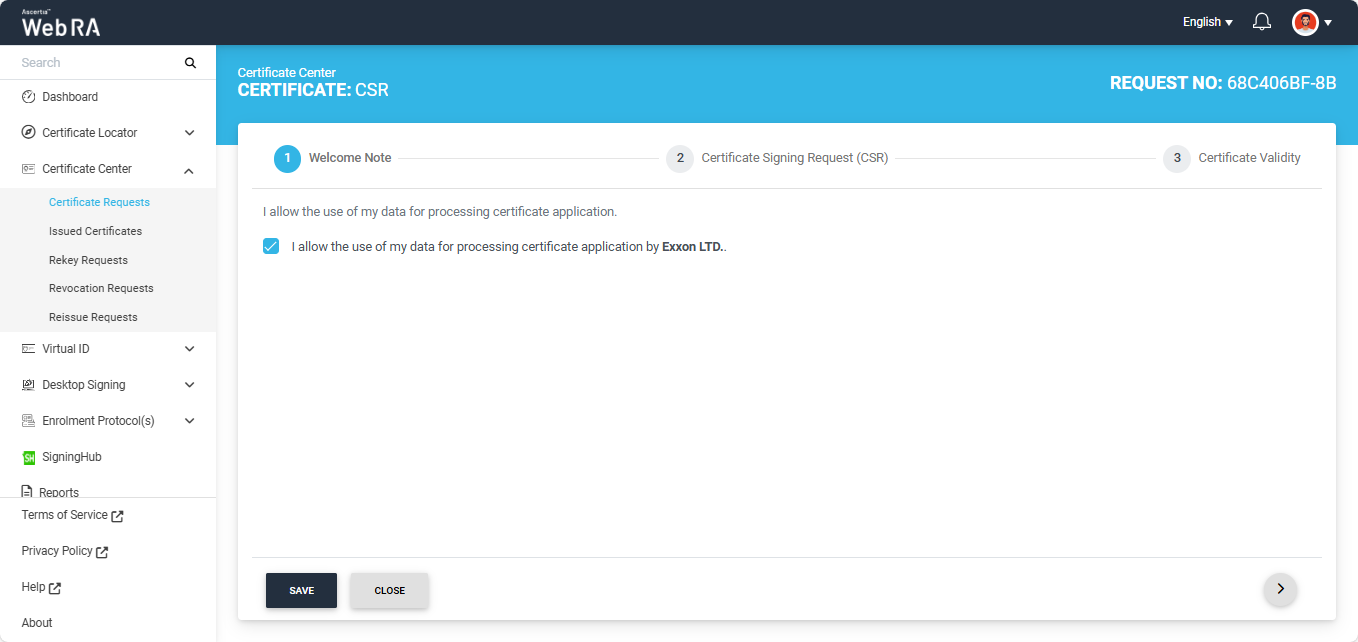 A "Welcome Note" screen will appear. Enable the ‘I allow the use of my data for processing certificate application by Enterprise Name’ and click next.