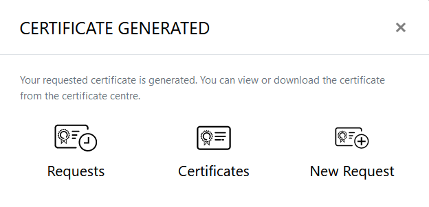 The system will generate the certificate and download it in your computer. You can find the certificate in the 'Downloads' folder on your computer. The certificate request will also be displayed in the 'Certificate Requests' listing.